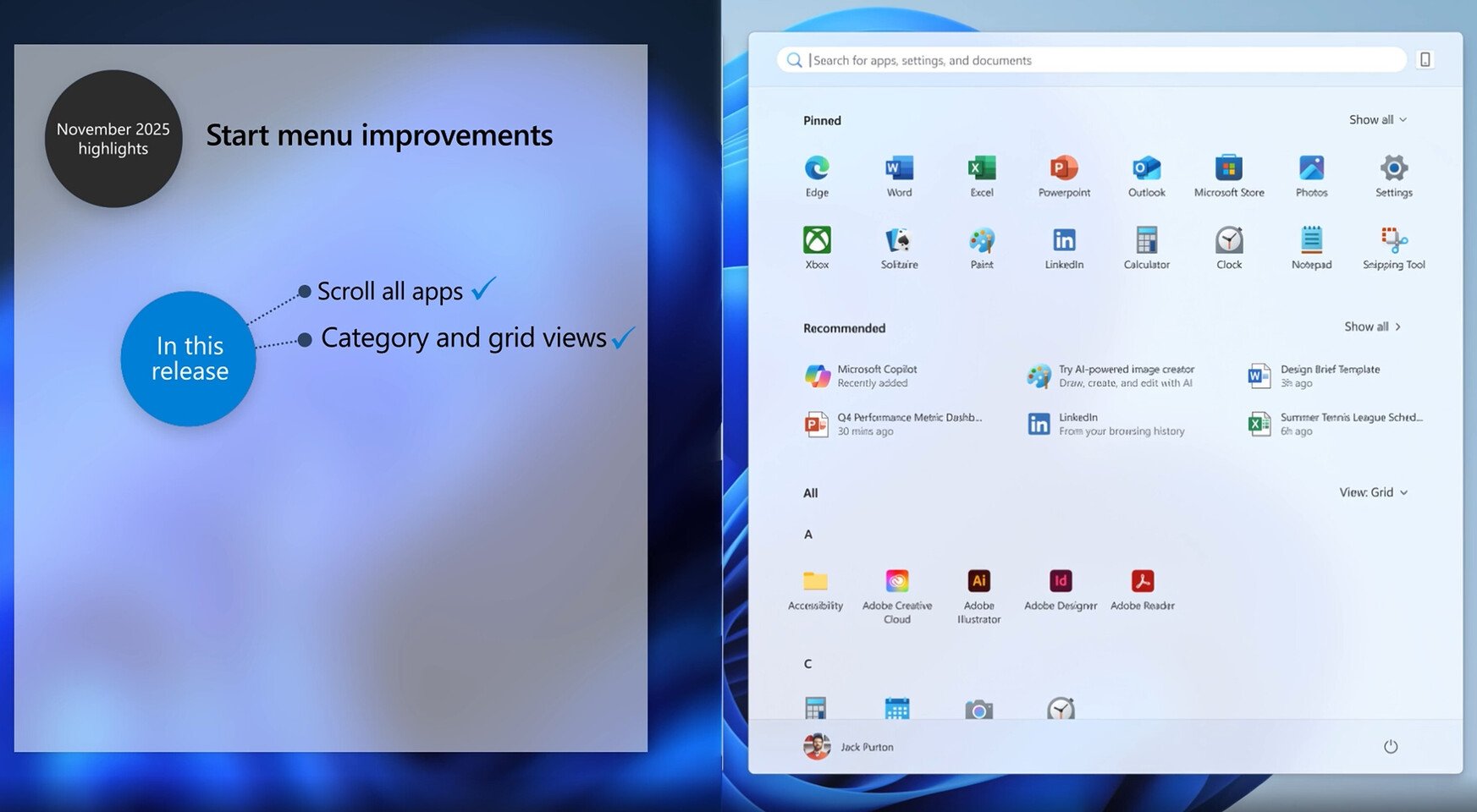 A Microsoft fejlesztőcsapata a legmodernebb Windows operációs rendszerhez, a Windows 11-hez egy új frissítőcsomagot készített, ami a novemberi Patch Tuesday keretén belül érkezett, és ezúttal nemcsak a hibajavításokra koncentrál, hanem meglepetésként néhány változtatást is eszközöl, már ami a Start menü funkcionalitását, illetve a noteszgépeknél és tábláknál használt akkumulátor ikont illeti. A KB5067035-ös frissítőcsomag telepítését követően az adott rendszer a 26200.7121 verziószámot viseli majd, de továbbra is a 25H2-es ágban marad, ami a jelek szerint a 26H1 alapját is képezheti, legalábbis a legutóbbi információk erre utalnak.