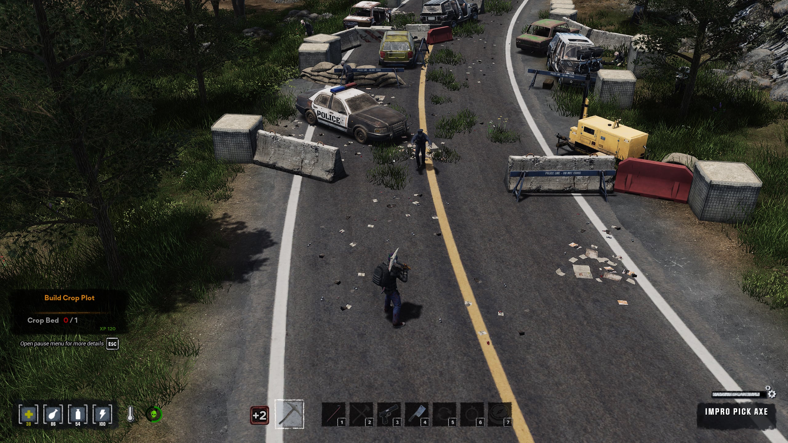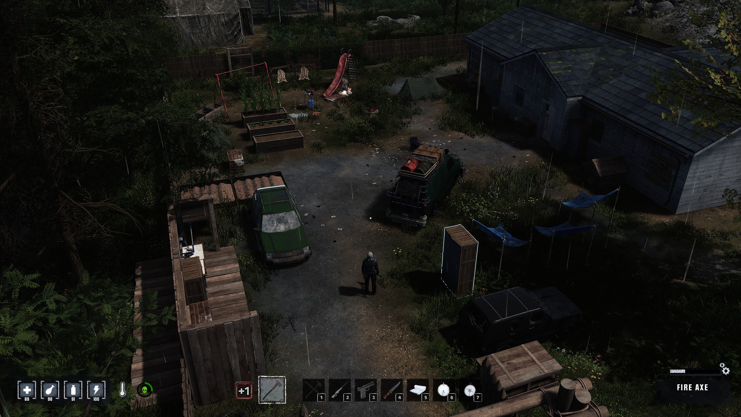 Falak, padló, lapos tető, ajtók, lépcsők, ágy – ennyi jelenleg a készlet és habár bővítést ígérnek a fejlesztők minden téren, ez a rész elég puritánra sikeredett, akkor is ha zombiapokalipszis van, meg minden. A tárolókból is 3 féle van, hacsak nem szeretnénk polcra kipakolni mondjuk a konzerveinket vagy autóalkatrészeinket. A perzisztens világ miatt a letett tárgyaink megmaradnak, de az izometrikus módban működő keresés távolság és irányfüggő, vagyis néha idegölő, mire a játék érzékeli, hogy arra a kis apró tárgyra nézünk, sokszor jobb tab-ot nyomva felvenni dolgokat.
