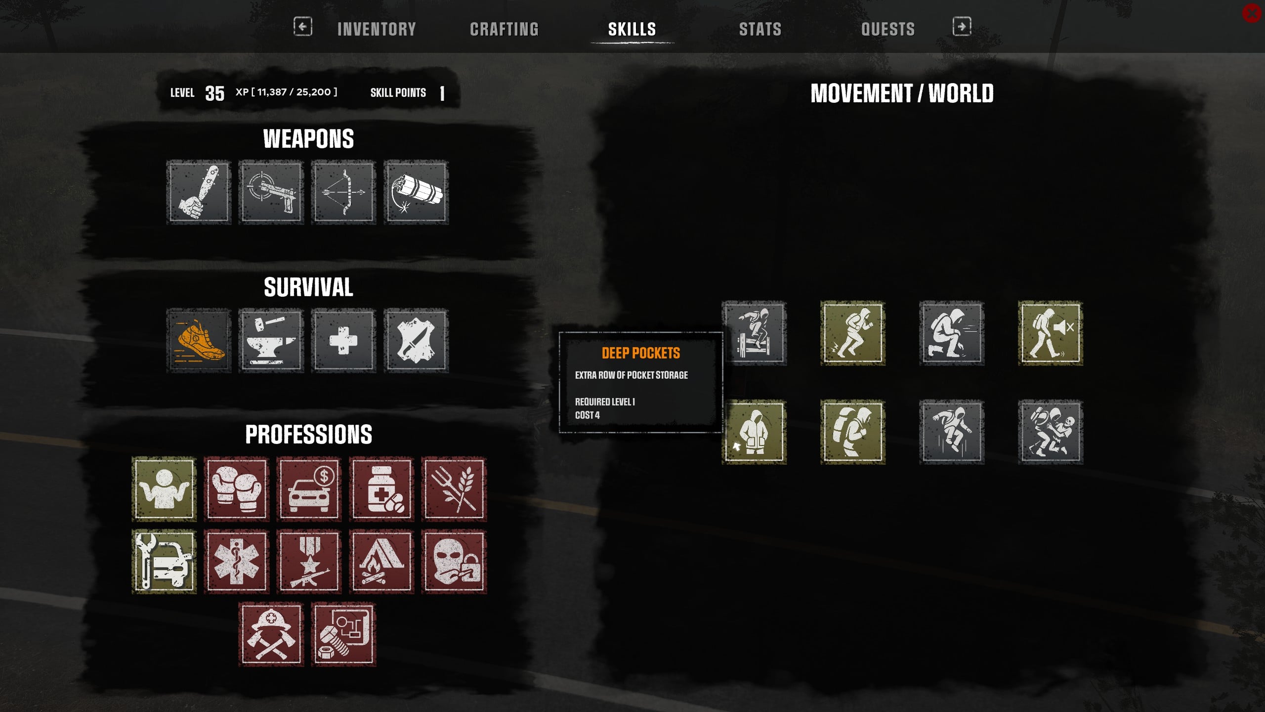 Karakterfejlesztés tekintetében skill pontokkal operáló RPG szintet kapunk, mert a különféle pl. harc, mozgás/elsősegély vagy mondjuk vadászathoz tartozó skillfa mellé különféle „kasztokat” vagyis szakmákat is kapunk, mindegyikkel egy adott területen könnyítve meg a dolgunkat. Kezdhetünk munkanélküliként is, ekkor több XP-t kapunk minden után, ezzel együtt pedig kétszer unlockolhatunk egy-egy szakmát 30. és 60. szinten, ha viszont eleve szakmával kezdtünk, akkor az már első szinten is elérhető. A játék jelzi, hogy bizonyos skillfák feloldásához mit kell megcsinálnunk és egy rövid tutorial, valamint egy túlélő kézikönyv nevű összefoglaló is a játék része, érdemes időt szánni rá.