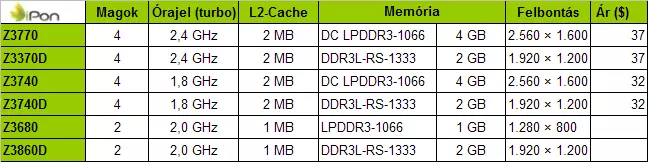 A Silvermont processzormagokat alkalmazó megoldások között mindenki meg fogja találni a magának megfelelőt, mert a teljesítményüket és a támogatott hardveres környezetet tekintve is széles skálát fednek le. A legolcsóbb és legenergiahatékonyabb masinákban például az Intel Atom Z3680 juthat majd főszerephez. Itt 512 kB-os L2 gyorsítótárat felvonultató Silvermont magok kettősével állunk majd szemben, melyek 1,33 GHz-en üzemelhetnek folyamatos terhelés mellett, ám ha a helyzet úgy kívánja, akkor rövid ideig 2 GHz-re is felgyorsíthat a lapka (egy mag használata esetén). Ehhez 1066 MHz-es LPDDR3 modulok csatlakoztathatóak összesen 1 GB-nak megfelelő mennyiségben, a maximális támogatott felbontás pedig mindössze 1280 x 800 pixeles. Ha ennél valamivel komolyabb megjelenítőt szeretnénk alkalmazni, de nem feltétlenül szükséges a nagyobb teljesítmény, akkor a Z3680D lehet a favoritunk. Ennél a processzor maradt változatlan formában, de a rendszermemóriája már 2 GB-nyi lehet, és a DDR3L-RS megoldásokkal is boldogul 1333 MHz-ig. A SoC-hoz 1920 x 1200 képpontos panel csatlakoztatható közvetlenül.