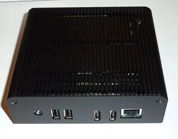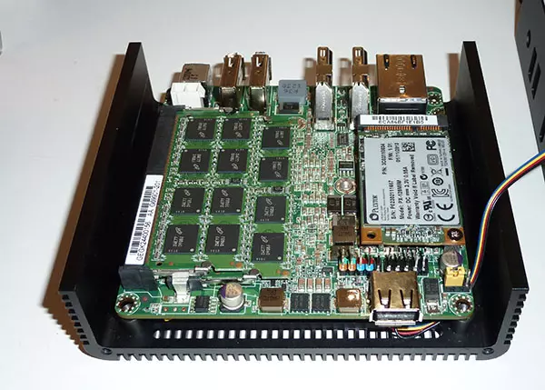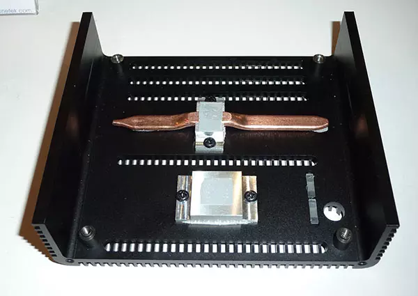 SilverStone PT14 NUC - Forrás: HeXus.netA NUC konfigurációkhoz tervezett ház valamivel kisebb, mint az Intel által tervezett műanyagház, plusz sokkal igényesebb kinézettel és felépítéssel is rendelkezik. Az alumíniumból készített kuckó egy nagy hűtőbordaként viselkedik, ami hatékonyan adja át környezetének a processzor által termelt hőt. A processzor egy kisebb hűtőtömbön keresztül érintkezik a számítógépház felső részével, a hőátadás hatásfokát pedig egy kilapított hőcső is segíti. A PCH egy nagyméretű, hőcső nélküli alumínium tömbön keresztül kapcsolódik a házhoz. A SilverStone mérnökei szerint a rendszer akár teljesen passzívan, ventilátor nélkül is tökéletesen működőképes, igaz, ekkor egy idő után eléggé felforrósodik a ház, ami a komponensek élettartamára szinte biztos, hogy negatív hatással van.