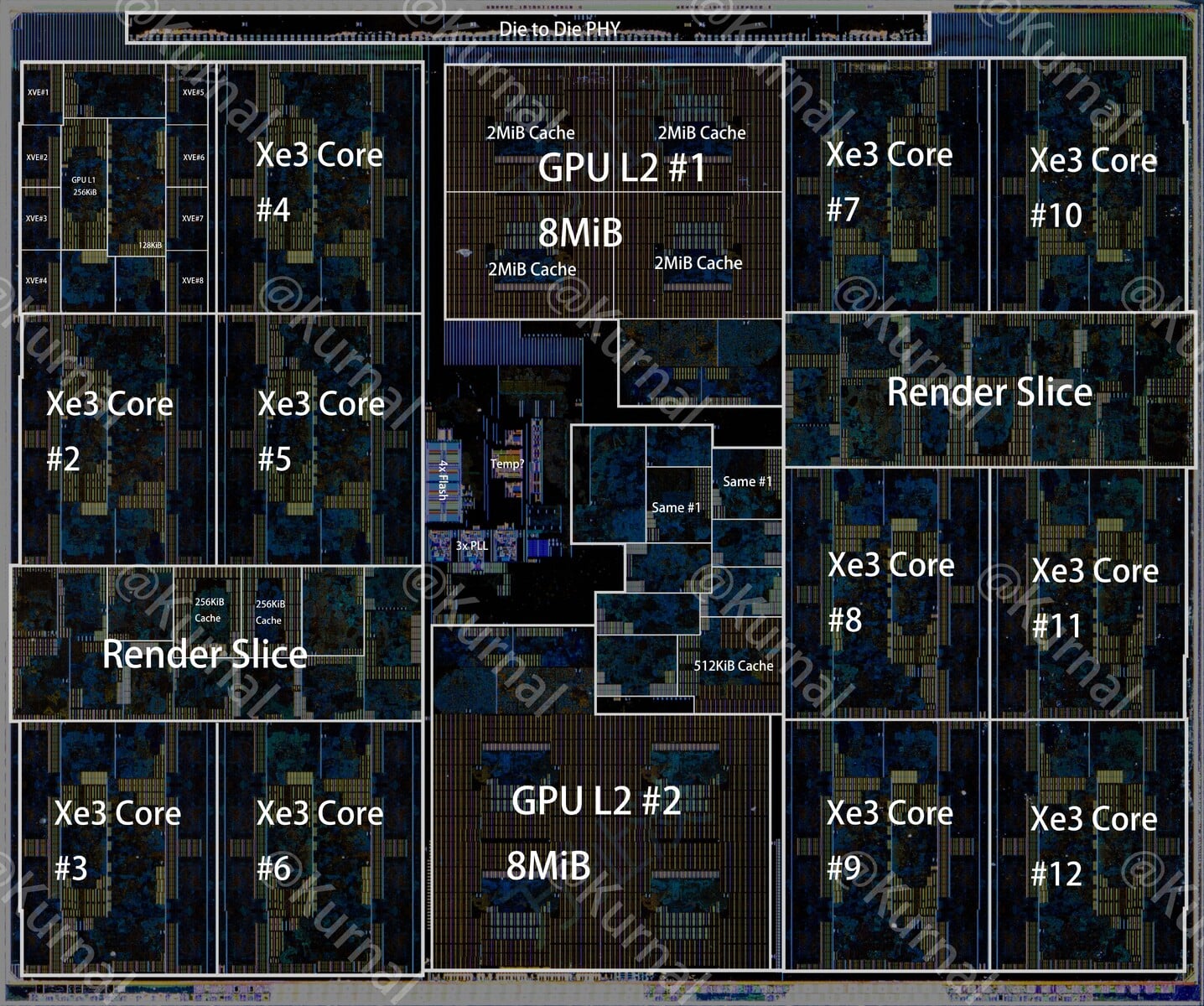 A fotón pont ez látható, viszont itt már nem az Intel 3, hanem a TSMC N3E gyártástechnológiája játszhatja a főszerepet. A Graphics Tile egy 55,18 négyzetmilliméteres kiterjedésű, azaz 8,14 milliméter széles és 6,78 milliméter mély lapka, ami a 12 darab Xe3-as mag mellett 16 MB-nyi másodszintű gyorsítótárat is tartalmaz.