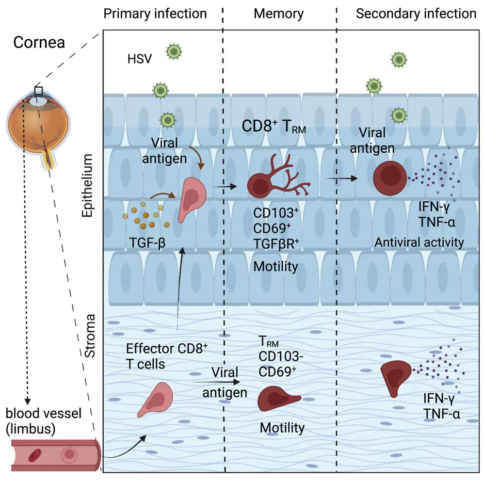 Az immunmemóriáról gondoskodó T limfocitákkal azonban – mint kiderült – más a helyzet. A kutatók multifoton-mikroszkópiával vizsgálták olyan élő egerek szemét, amelyeket herpeszvírussal fertőztek meg. Ennek során látták, ahogy a citoxikus T sejtek és a T segítő sejtek belépnek a szaruhártyába, majd ott egy hónapig is jelen vannak a fertőzés után. A további kutatások azt is feltárták, hogy a T sejtek hosszúéletű memóriasejtekké alakultak, amelyek megmaradtak a szaruhártyában.
