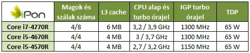 A fenti táblázatból is jól látszik, hogy az R sorozat tagjai nagyjából hasonló maximális Turbo Boost órajelet kínálnak, mint asztali társaik, ám alap magórajel tekintetében már alacsonyabb értékeket tapasztalhatunk, mint a klasszikus asztali Haswell APU egységeknél. A 65 wattos TDP ugyancsak alacsonyabb, mint a normál asztali Haswell APU egységek 84 wattos TDP-je.