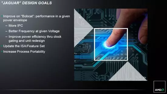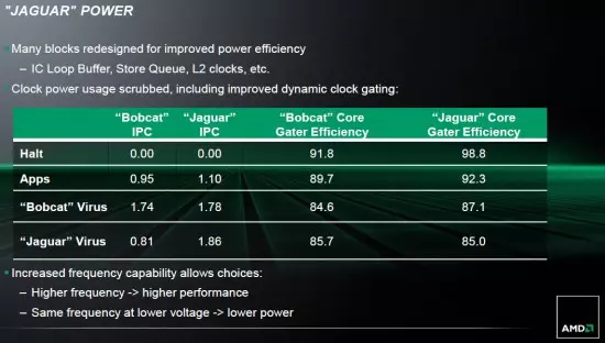 Annak érdekében, hogy a Bobcat (Brazos platform APU-jai épülnek erre) alapú megoldásokhoz képest az új APU-k jobb teljesítményt kínálhassanak, az AMD gyakorlatilag minden lehetséges területen változtatásokat eszközölt: nőtt a rendelkezésre álló processzormagok száma, nőtt az órajel, bekerült a repertoárba a legmodernebb utasításkészletek támogatása és nőtt az órajelenként végrehajtható műveletek száma is. Ezzel együtt persze az energiahatékonyság növelése is fontos szempontot képvisel, így ebben az irányban is történt némi előrelépés. Például az új dizájnnak és az optimalizációknak köszönhetően a Jaguar alapú megoldások alacsonyabb üresjárati fogyasztás mellett üzemelnek, mint a jelenleg forgalomban lévő alacsony fogyasztású megoldások.