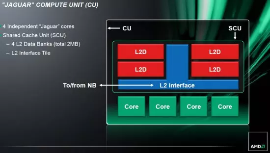 A Jaguar alapú APU egységek maximum négymagosak lehetnek, és a négy mag összesen 2 MB-nyi megosztott gyorsítótárral gazdálkodhat. A másodszintű gyorsítótár 512 KB-os adatbankokra lesz felosztva, amelyek szükség esetén egymástól függetlenül is kikapcsolhatóak lesznek, így energia megtakarítására nyílik lehetőség.