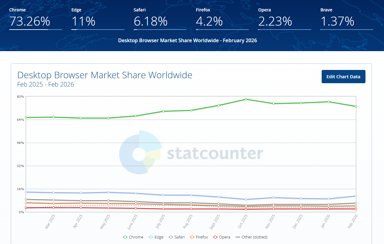 A Mozilla új vezetője már felvázolta, milyen változásokkal próbálják ütőképsebbé tenni a vállalat webböngészőjét, a mostanság kissé háttérbe szorult Firefoxot, ami jelenleg mindössze 4,2%-os piaci részesedéssel rendelkezik, így a negyedik helyen található az asztali webböngészők szegmensében. A StatCounter februári adatai szerint harmadik a Safati 6,18%-kal, a második a Microsoft Edge 11%-kal, míg az első a Chrome a maga 73,26%-ával. A Mozilla csapata a jókora lemaradás ellenére sem fordít hátat az asztali webböngészők piacának, sőt, számos hasznos újítással készülnek, amelyek közül az egyik legjobban várt, a globális AI kapcsoló, ami az összes AI funkció letiltását segíti, a webböngésző 148-as változatában már debütált, még február folyamán.