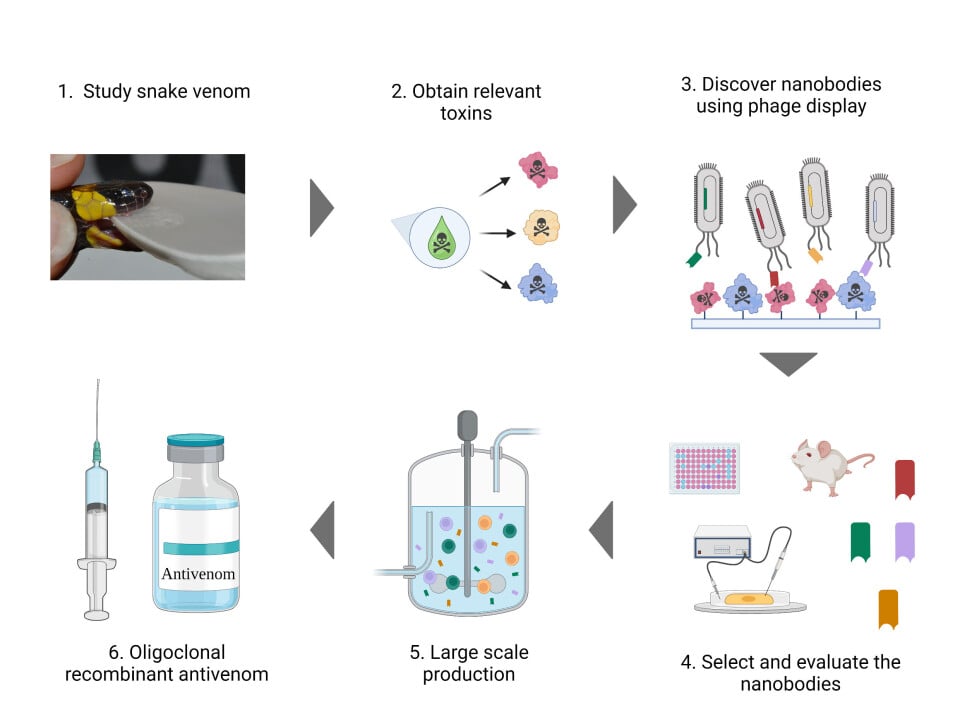 A csapat a láma és az alpaka nanotestek DNS-szekvenciáit Escherichia coli baktériumokhoz adta hozzá, hogy in vitro nagy mennyiségben állítsák elő ezeket. Ezután kiválasztották azokat, amelyek a leghatékonyabban inaktiválták 18 kígyó, köztük 13 kobrafaj és négy mambafaj mérgét.