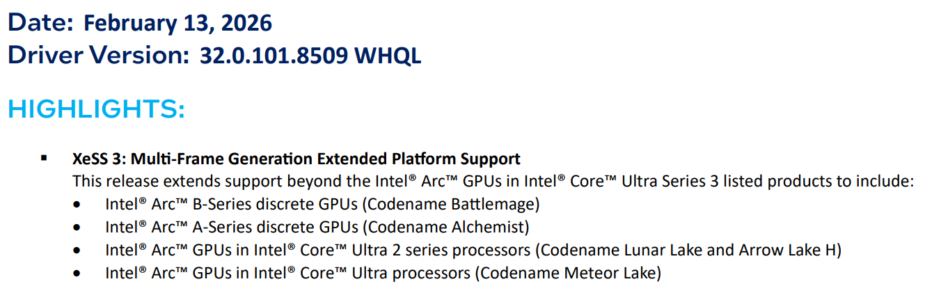 Az új driver, amivel szélesebb körben is elérhetővé válik az XeSS 3 Multi-Frame Generation támogatás az Intel Arc sorozatú termékeket tartalmazó kínálaton belül, innen tölthető le a Windows 10, illetve a Windows 11 operációs rendszerrel ellátott konfigurációkhoz. Videokártyák terén az Arc A és az Arc B sorozat tagjait támogatja az említett technológia, míg iGPU tekintetében a Meteor Lake, a Lunar Lake, illetve az Arrow Lake-H processzoroknál, vagyis a Core Ultra és a Core Ultra 2 sorozatú processzoroknál lehet bevetni, valamint a Panther Lake modellek sem hiányoznak a támogatott termékek köréből.