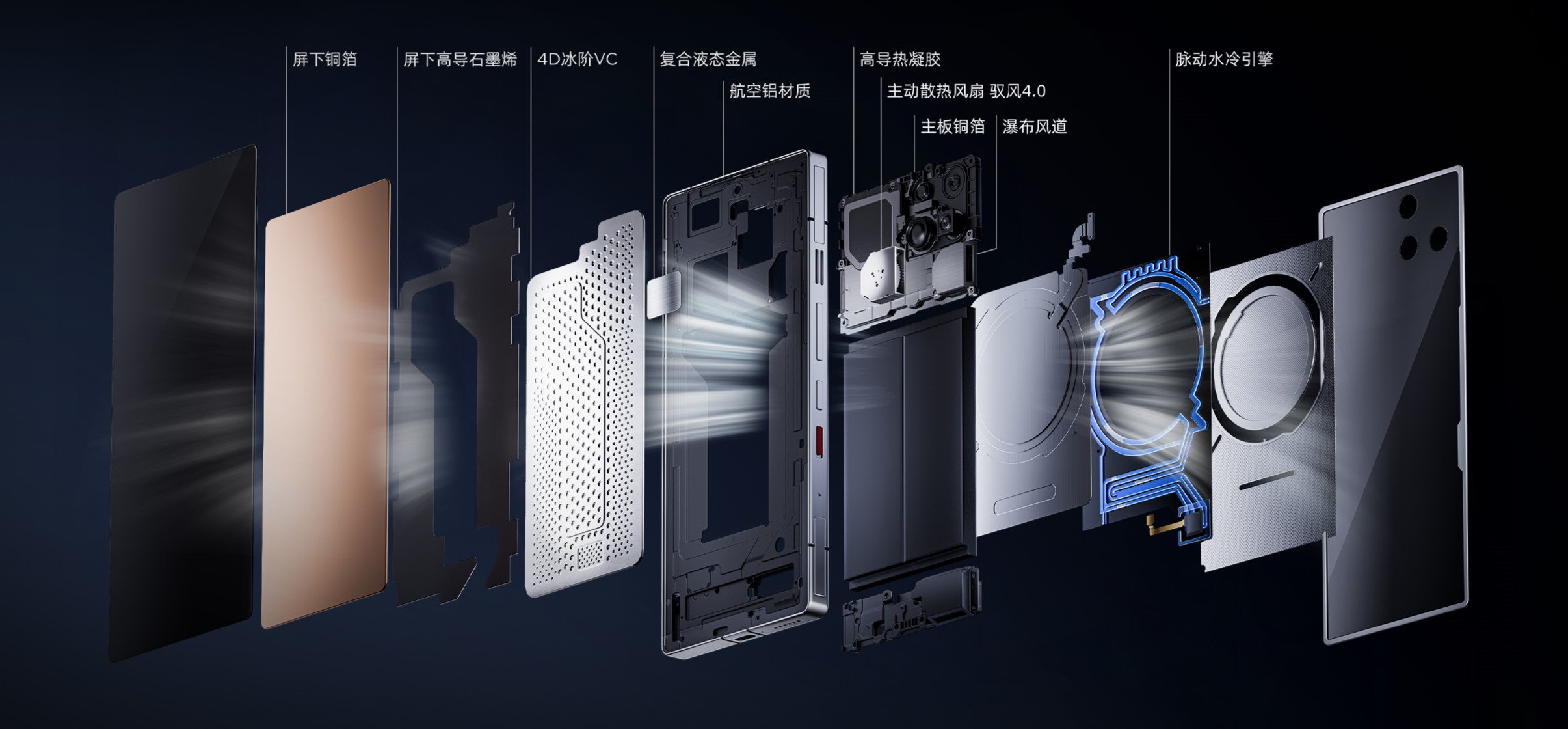 A Redmagic 11 Pro egy hatékony passzív hőelvezető egységet és egy 24 000 RPM fordulatra képes ventilátort használ a hűtésre. A Redmagic 11 Pro+ pedig még ezeken felül nyújtja az aktív folyadékhűtő rendszert, amit a napokban volt lehetőségünk külön is bemutatni. A konstrukció lelke a piezoelektromos pumpa, ami pulzálva forgatja majd a hűtőfolyadékot a hátlap alatt elhelyezett csövek gyűrűjében. Részben megnyitotta a hátlapot a Redmagic, így látni lehet majd, ahogy kering a „hűtővíz”. Erről azt kell tudni, hogy extrém fagynak is ellenáll, egyáltalán nem kell félteni szélsőséges időjárási viszonyokban.