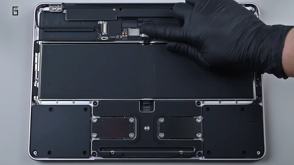 A MacBook Neo házának kinyitása után fény derült a komponensekre, amelyekhez némi csavarozás és némi ragasztószalag eltávolítását követően lehetett hozzáférni. Az alaplap, amin a SoC található, eléggé sűrűnek mondható, már ami a komponensek elhelyezését illeti, itt kapott helyet egyebek mellett a NAND Flash modul is, ami jelen esetben 256 GB-os kapacitással bírt.