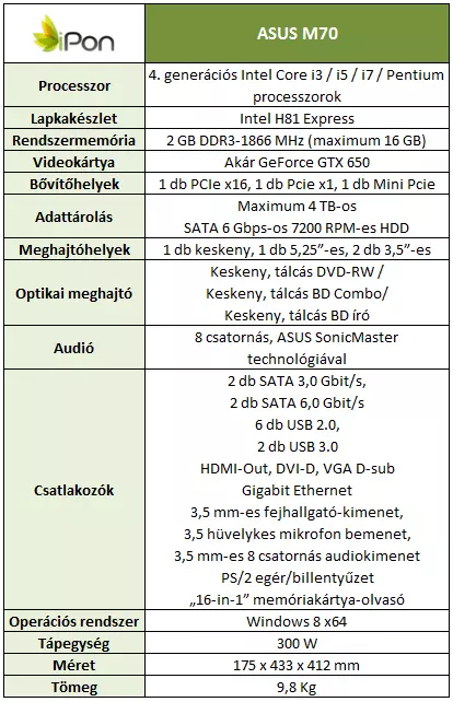 Az ASUS M70-es asztali számítógépe letisztult dizájnnal rendelkező, szálcsiszolt fém borítással ellátott házat kapott, ami meglehetősen érdekes dolgokat rejt. A termék belsejében a legfrissebb, negyedik generációs Core i sorozatú Intel processzorok kaphatnak helyet, videokártyából pedig akár Nvidia GeForce GTX 650-es modell is elérhető lesz.