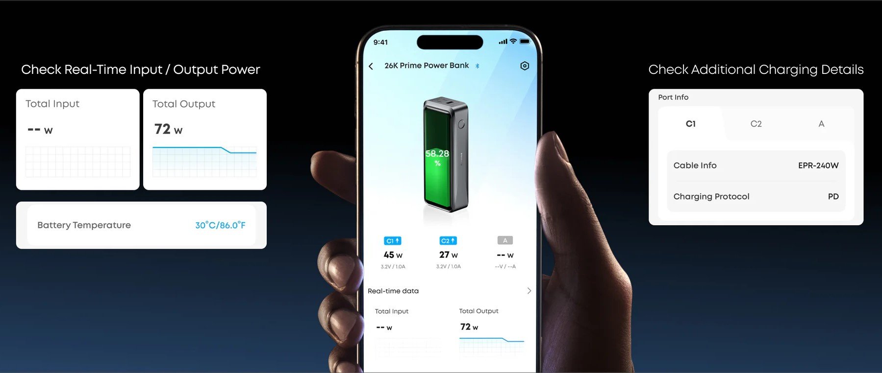 A kiegészítő rendelkezik egy informatív kijelzővel, amin nagyon sok adatot tud megjeleníteni a töltési folyamattal, akkumulátor állapotával kapcsolatosan. De az igazán komoly diagnosztikai lehetőséget itt a Bluetooth kapcsolattal és a mobiltelefonos applikációval lehet elérni. Figyelhető a töltés közben a portok teljesítménye – ezt lehet korlátozni is –, látszik az akkumulátor pontos töltöttségi szintje, a hőmérséklete, és még az is megjelenik, hogy a töltés éppen milyen protokoll alkalmazása mellett zajlik. Továbbá a beépített képernyőn megjelenő „képernyőkímélő” is cserélhető.