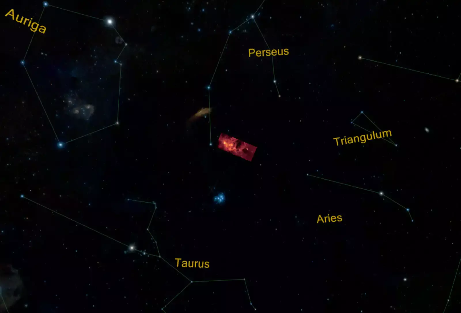 A felhőben több más érdekes részlet is látható. A bal oldalon látszódó fényes csomó az IC 348 nevű, rendkívül fiatal csillaghalmaz. A molekulafelhők gyakran szolgálnak csillagbölcsőkként, hiszen azokon a helyeken, ahol a helyi sűrűség magasabb anyagukban, gravitációs összeomlás következhet be, és csillagok képződhetnek. Az IC 348 esetében pontosan ez történt, a halmaz mindössze néhány millió éves, és eddig jobbára a Naphoz hasonló csillagokat termelt ki. A halmaz éppen ezért korlátozottan látható, mivel a nem túl erős csillagfényt elfedi a környező por.