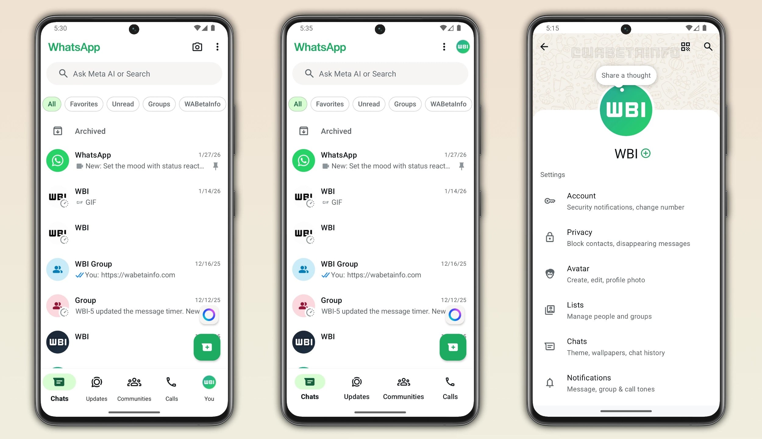 A jövőben a WhatsApp egyszerűbb elérést biztosít majd a felhasználói beállításokhoz, a profiloldalhoz. Az alkalmazás képernyőjének alsó sávján az eddigi lapfülek mellett felbukkant egy “You” feliratú oldal, amivel azonnal a felhasználói beállításokhoz lehet ugrani. Emellett pedig a képernyő jobb felső sarkában is elérhető egy profilképes ikon révén ugyanez a szekció. A béta keretében néhány embernél mindkét lehetőség elérhető lett, de a végleges frissítésben valószínűleg az alsó lapsávról elérhető opció fog megmaradni.