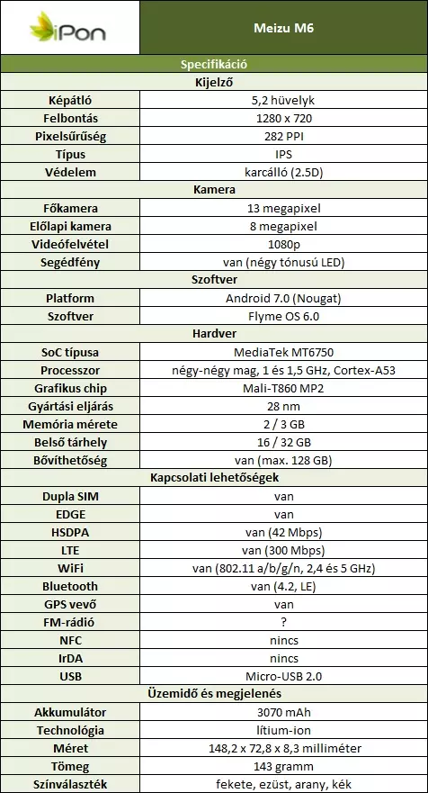 Az újdonságban egy nyolcmagos központi chip húzza az igát. A MediaTek MT6750 dolgozik a színfalak mögött, ami egy Mali-T860 MP2 grafikus feldolgozót, valamint egy 1 és egy 1,5 GHz-es Cortex-A53 kvartettet vonultat fel. A teljesítményre általában ilyen szinten már nem lesz panasz, legfeljebb a hardverigényesebb műveletek esetén gondolkodhat el a gépezet. Ami a rendszermemóriát és a háttértárat illeti, kettő különböző konfigurációval kell számolni a Miezu M6 esetében. Az alapot egy 2 GB RAM-mal és 16 gigás adattárolóval szerelt gép jelenti, de készül olyan variáns, amiben már 3 GB a memória, a tárhely pedig 32 GB-tal szolgál. Bővítési lehetőség mindkét kivitelnél adott. 4G LTE hálózati modemmel a kelléktárában érkezik az okostelefon, melynek köszönhetően a VoLTE-t is támogatja. Ezen felül van még a kapcsolati opciók lajstromán 802.11 a/b/g/n szabványoknak megfelelő, kétsávos Wi-Fi, Bluetooth 4.1 LE modul és A-GPS vevő, ami a GLONASS rendszerre is támaszkodhat a hatékonyabb működés érdekében.