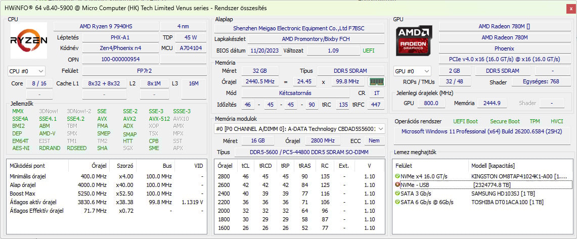 | CPU | AMD Ryzen 9 7940HS, 8 mag / 16 szál (16M cache, max. 5.2 GHz) |