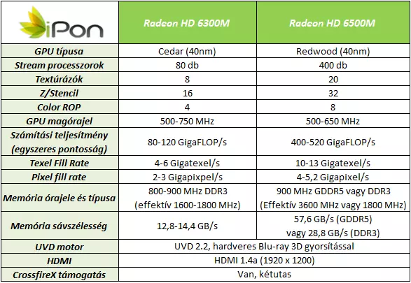 A Radeon HD 6500M GPU-ja 400 stream processzorral, 20 textúrázóval, 32 Z/Stencil ROP egységgel és 8 Color ROP-pal érkezik. A GPU GDDR5-ös vagy GDDR3-as típusú fedélzeti memóriához csatlakozik, modelltől függően. Az újdonság UVD3-as helyett "csak" UVD 2-es videó motorral rendelkezik, így specifikációit tekintve nagyban hasonlít a Radeon HD 5700M sorozat tagjaira. A másik friss videokártya a Radeon HD 6300M típusjelzést kapta. Ez a modell már 320-szal kevesebb, azaz csak 80 stream processzorral érkezik, de a GPU ezen kívül rendelkezik még 8 textúrázóval, 16 Z/Stencil és 4 Color ROP-pal is. A 6300M sorozat tagjai fedélzeti memóriaként DDR3-as memóriachipeket használnak. A specifikációk alapján ez a változat a Radeon HD 5450-es modellre hasonlít.