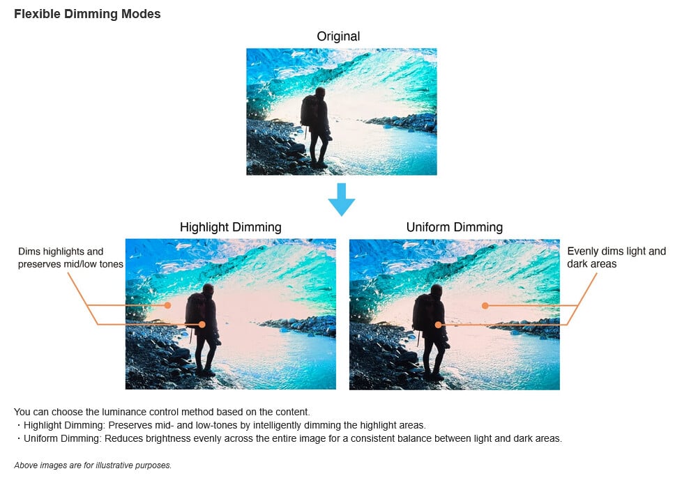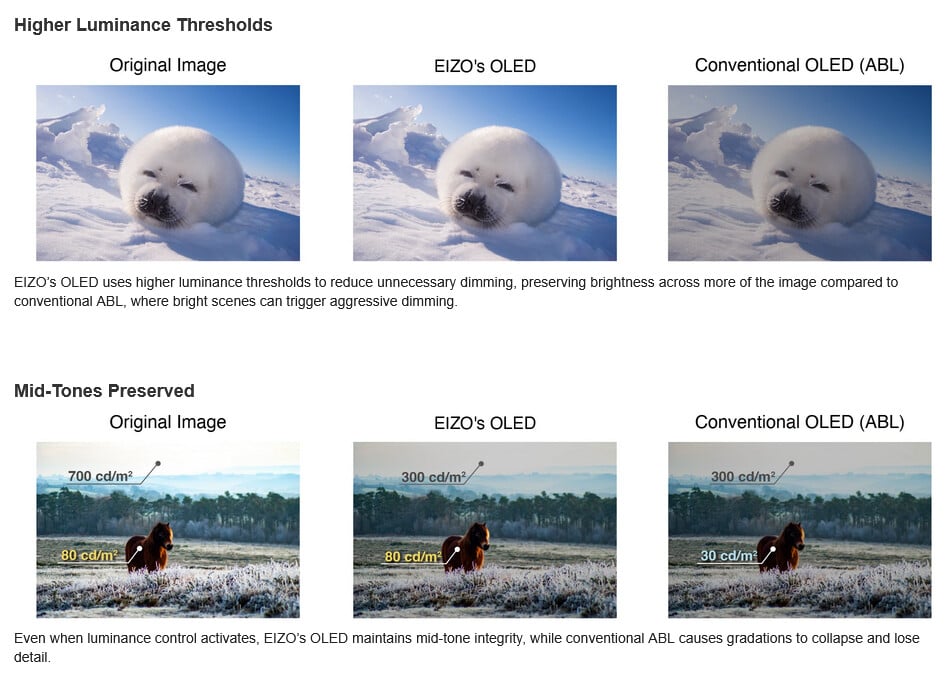 A gyártó szerint az új monitornál az OLED panelekre jellemző ABL (Auto Brightness Limiter) funkciót is ötletesen kezelik, ami alap esetben képes a teljes képet sötétebbé tenni, ha sok világos képterület megjelenítésére kerül sor. A negatív hatások elkerülésének érdekében ebben az esetben magasabb fénysűrűség-küszöbértékeket vetnek be, ezáltal csökkenthető a nem kívánt sötétedés, valamint jobban megőrizhetőek a középtónusok is. Két mód közül lehet majd választani, amelyek közül a Hightlight Dimming esetében a fényes területeket fogja sötétíteni az algoritmus, míg az Uniform Dimming segítségével a teljes kijelző területére kiterjedő, egyenletes fényesség-csökkentést lehet alkalmazni, ami a sötétebb és a világosabb területeket egyaránt érinti, ezáltal megmarad köztük az egyensúly is. Ha a luminancia-vezérlés aktív, akkor egy kék LED ezt jelezni fogja.