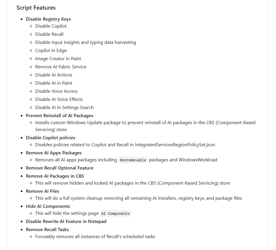 A szkript használatát egy részletes leírás segíti, valamint videót is készített a fejlesztő annak érdekében, hogy minél hatékonyabban és gyorsabban lehessenek túl a folyamaton az AI-tól szabadulni vágyók. A szkript nem tudja például letiltani a Gaming Copilot, a OneDrive AI, illetve a Windows Studio Effects névre keresztelt funkciót sem, de ezek kikapcsolása nem egy nehéz feladat, hála a leírásnak