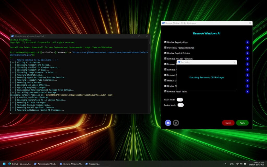 Maga a szkript a PowerShell konzol segítségével futtatható, ám érdemes az 5.1-es kiadást használni, a 7-es mellett ugyanis előfordulhatnak problémák. Az AI funkciók jó része önkéntesen használható, legalábbis egyelőre, míg a többi sokszor a háttérben futva várja, hogy szükség legyen rá, ezzel értékes rendszer-erőforrást pazarolva minden olyan konfiguráción, ahol az adott felhasználó a háta közepére se kívánja az AI körüli felhajtást.