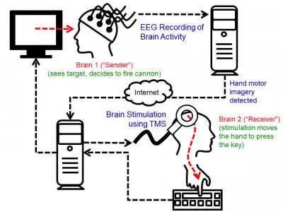 A Washingtoni Egyetem kutatói először hoztak létre noninvazív, két emberi agyat „összekötő” interfészt: az egyik kutató az interneten továbbított agyi jelekkel képes volt munkatársa kézmozgásait vezérelni. A Duke kutatói nem olyan régen két patkány, a Harvard munkatársai pedig ember és patkány közt teremtettek hasonló összeköttetés, ez az első eset azonban, hogy ember és ember közt létesül ilyen kapcsolat.