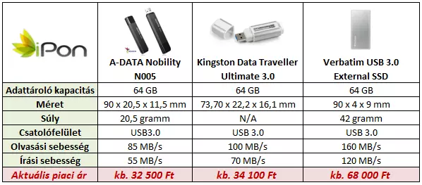 A tesztben szereplő Kingston Data Traveller 3.0-s pendrive-ot a Kingston hazai képviseletétől, a Verbatim USB 3.0 External SSD-t a Corwell Kft.-től, az A-DATA Nobility N005 pendrive-ot pedig a Ramiris Kft.-től kaptuk kölcsön, ezúton is köszönet értük!