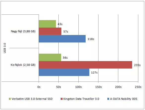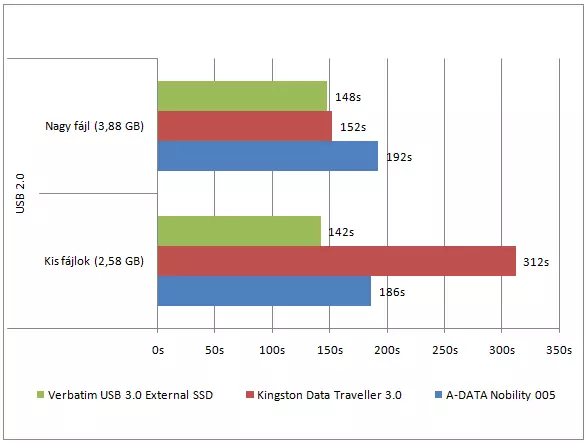 Első körben egy 3,88 GB-os, egyetlen nagy fájlt tartalmazó könyvtárat másoltunk át a tesztrendszer 3,5 hüvelykes, 500 GB-os Seagate merevlemezéről a pendrive-okra, majd a későbbiekben egy 2,58 GB-os könyvtárral próbálkoztunk, amely tömve volt pici képekkel, dokumentumokkal és néhány MP3 is lapul a több tucatnyi könyvtárban. Ahogy az a fentiekből is szépen látszik, a Kingston pendrive nagyon szépen tartotta a lépést a Verbatim külső SSD-jével, amikor nagy fájlt kellett másolni, ám kis fájlok esetén még a papíron lassabb A-DATA pendrive is beelőzte a Kingston SSD-jét, a Verbatim SSD-ről nem is beszélve. A tesztet USB 2.0-s csatolófelületen keresztül is elvégeztük, pusztán érdekességképpen.