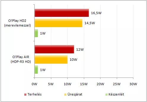 Az új O!Play a 3,5 hüvelykes merevlemeznek köszönhetően pár wattal többet fogyaszt, mint elődei, de ez nem csoda. Hogy pontosan miként alakul a fogyasztás, azt az alábbi kis diagram mutatja be.