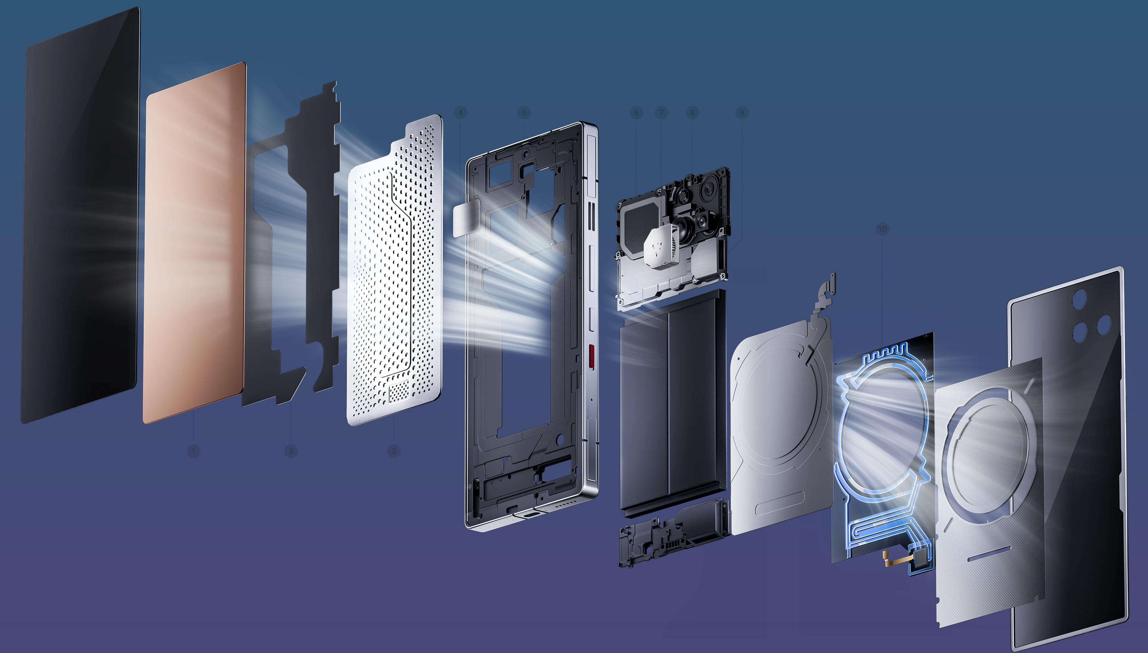 A piezoelektromos motorral keringetett folyadékhűtésen túl is nagyon komplex a hőelvezetés megoldása a Redmagic 11 Pro+ keretei között. Található még a felszín alatt vapor chamber rendszerű felület, rézfólia, grafén és folyékony fém a lehető legjobb hőátadásért, és még egy 24 000 RPM-es fordulatszámon pörgő hűtőventilátor is része a konstrukciónak. Mondhatni tényleg minden fel van itt sorakoztatva, amit csak el lehet képzelni.
