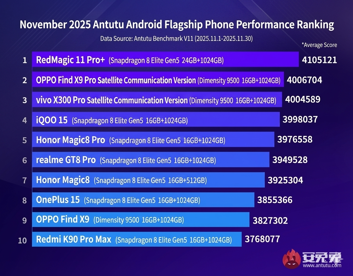 Az AnTuTu novemberi összeállításában egy egészen kicsivel 4 millió pont feletti adat szerepel az Oppo Find X9 Pro és a Vivo X300 Pro neve mellett is. Ezek a készülékek a MediaTek által tervezett Dimensity 9500-nak adnak otthont. A Qualcomm egységével ringbe lépő iQOO 15 és Honor Magic8 Pro már éppen elmaradna a 4 milliós álomhatár elérésétől. De a lista élén nem az Oppo és a Vivo eszközei állnak, hanem az alapvetően gamereknek Redmagic 11 Pro+.