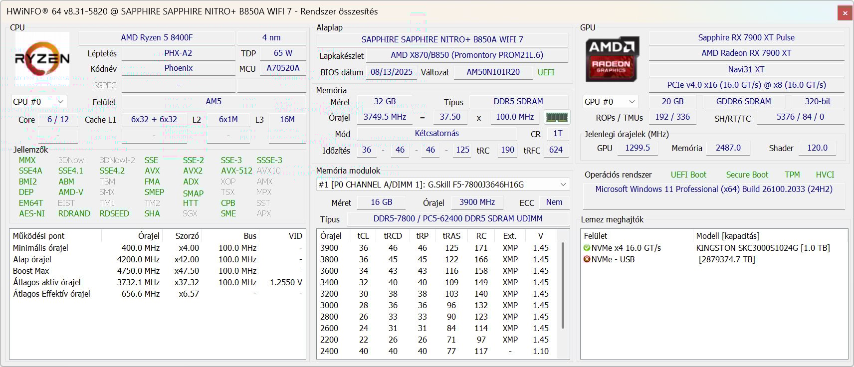 A rendszer alapvetően mindvégig stabilan és hibátlanul futott, akár megterhelőbb tesztekről, akár játékokról volt szó. A Cinebench 2024, PassMark, Geekbench vagy CrystalDiskMark szoftverek számos alkalommal szépen lefutottak és alapvetően hibahatáron belüli, releváns értékekkel szolgáltak, az adott konfiguráció képességeihez viszonyítva. Sőt, lényegében nem igazán maradnak alul a jóval drágább X870E lapok képességeivel szemben sem, ami elismerésre érdemes munka a Sapphire részéről.