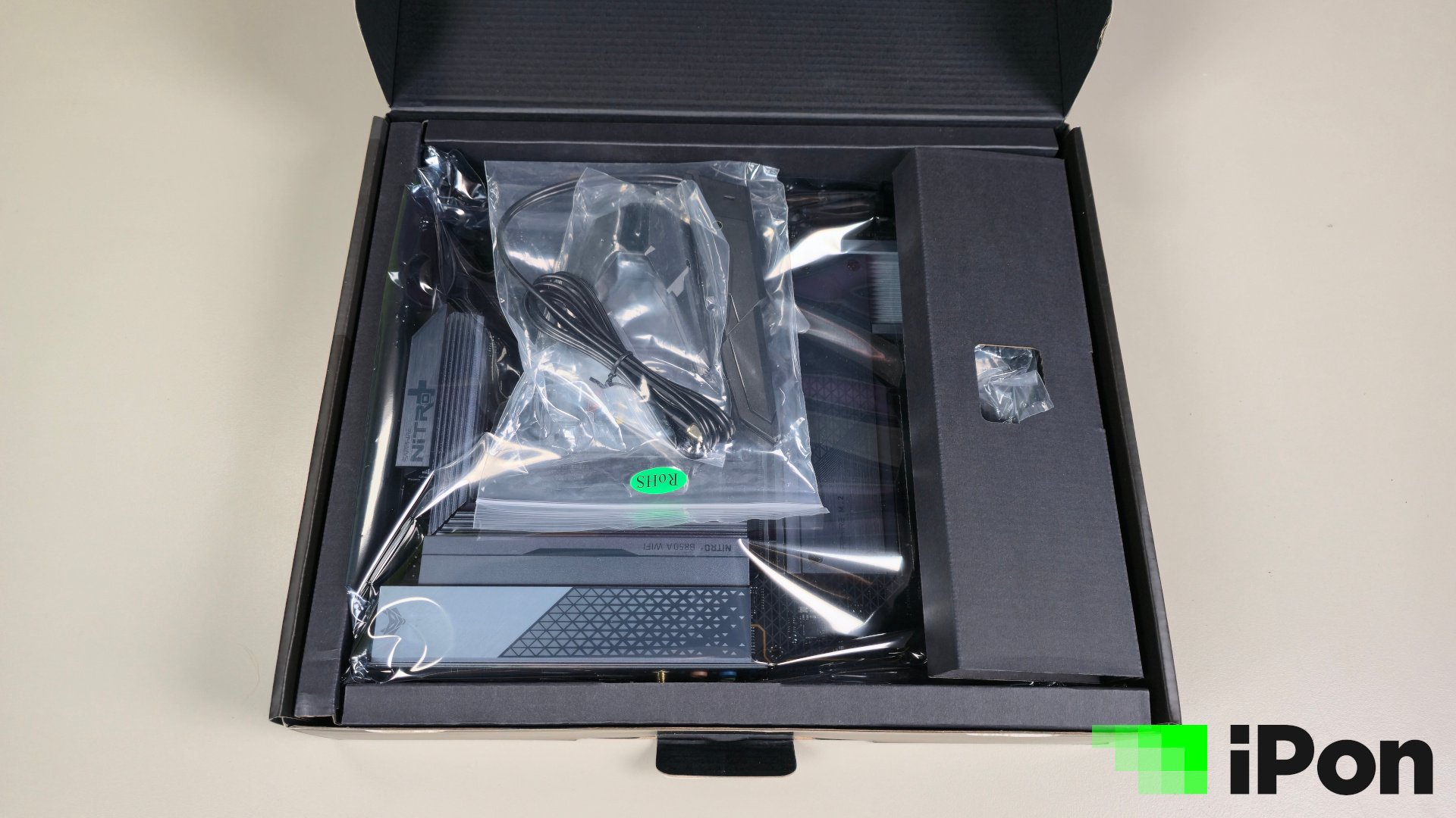 A B850A azonban teljesértékű ATX lap friss WIFI szabvánnyal, ahogy erről és még számos egyébről már a doboz hátoldala is alaposan tájékoztat bennünket. A fedelet felnyitva a fogadtatás elég visszafogott, lényegében a mágnesesen rögzíthető WIFI-antenna elemein túl csak egy pár SATA kábelt, illetve a tájékoztató kiskönyvet találjuk az extrák között. Ez a termék azonban láthatóan egy igazi kedvcsináló akart lenni, hiszen a pofás megjelenése és korrekt felszereltsége mellett az árát is igyekeztek barátságosra faragni, szóval érthető, hogy a körítést már nem vitték túlzásba.
