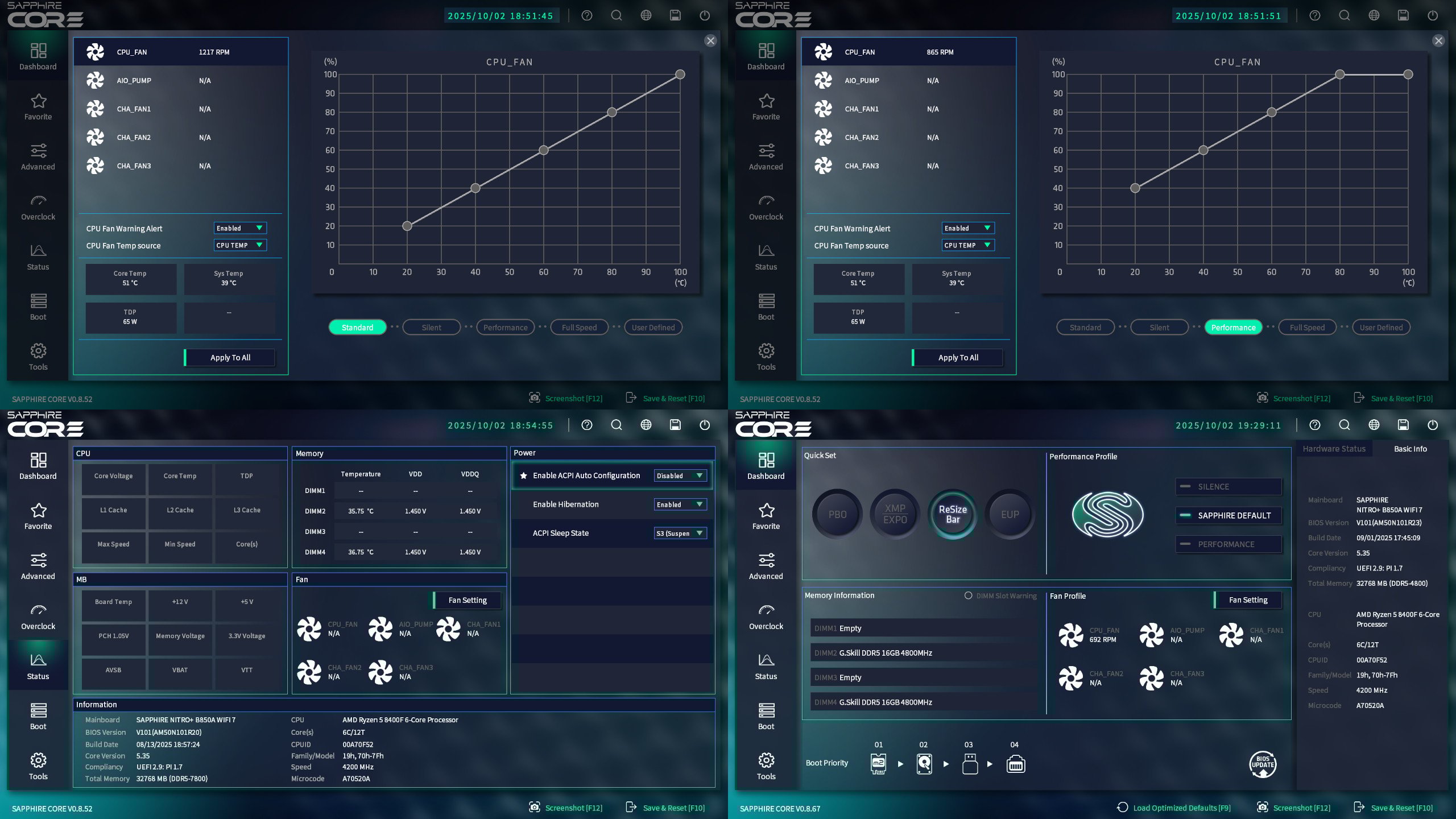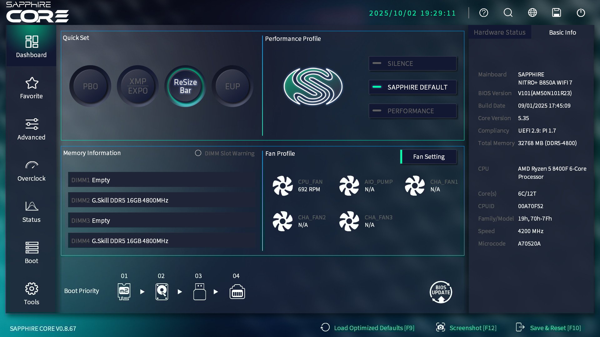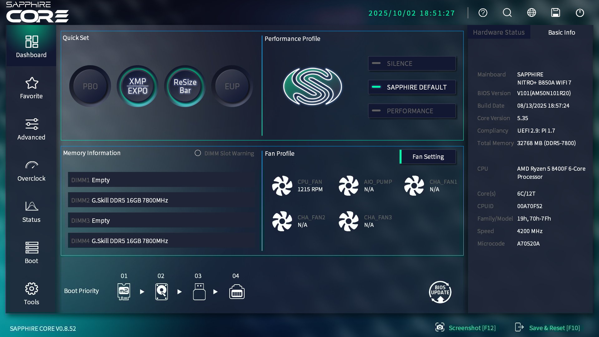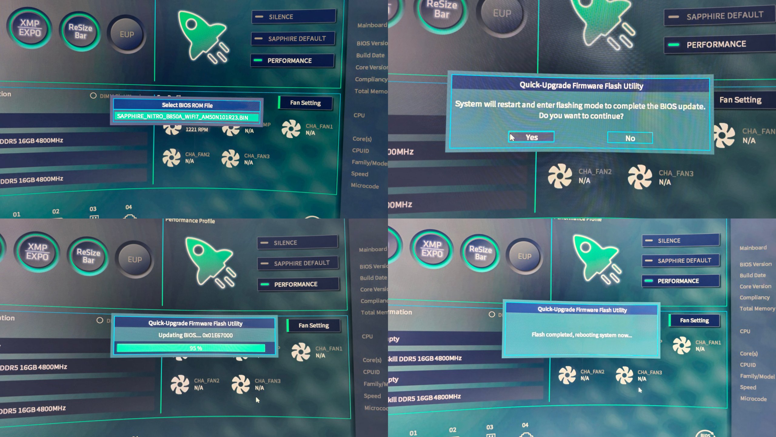 Ami a teljesítményt illeti, a Performance kapcsoló nem csak a ventik viselkedésére van hatással, de azonnal kitolja a CPU fogyasztási keretét a külön is kapcsolható PBO (Precision Boost Overdrive) gomb aktiválásával, illetve a Resizable Bar is bekapcsol. Nekünk már csak az XMP-t kell külön benyomni és a rendszer máris használatra készen áll. A kíváncsiság kedvéért elvégeztem egy BIOS-frissítést is, mivel a honlapon volt újabb verzió. A pendrive-ra másolt fájlokat gond nélkül felismerte, a folyamat pedig gond nélkül lezajlott, így elmondható, hogy ez nem talán egy maradéktalan tuning BIOS, de kifejezetten átgondolt és felhasználóbarát, ezt a fontos ellenőrzőpontot a Sapphire ügyesen teljesítette.