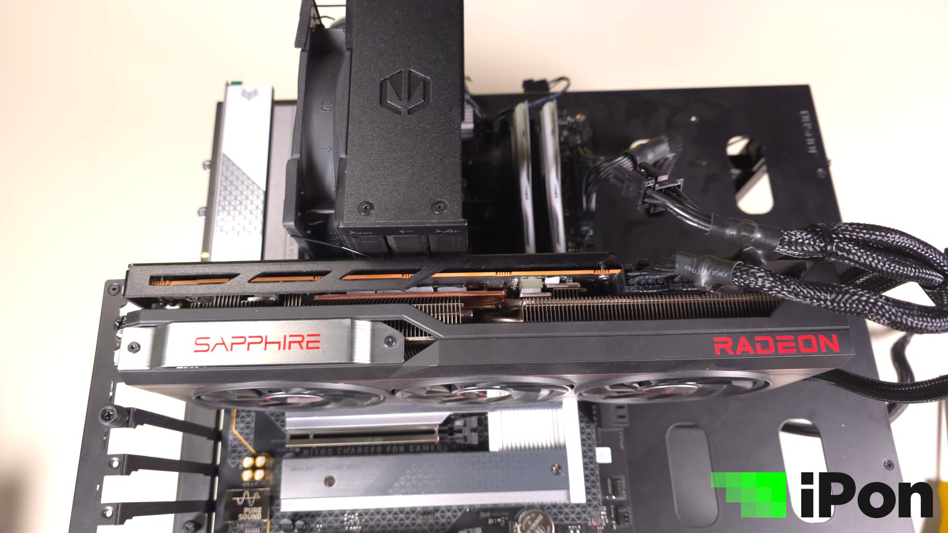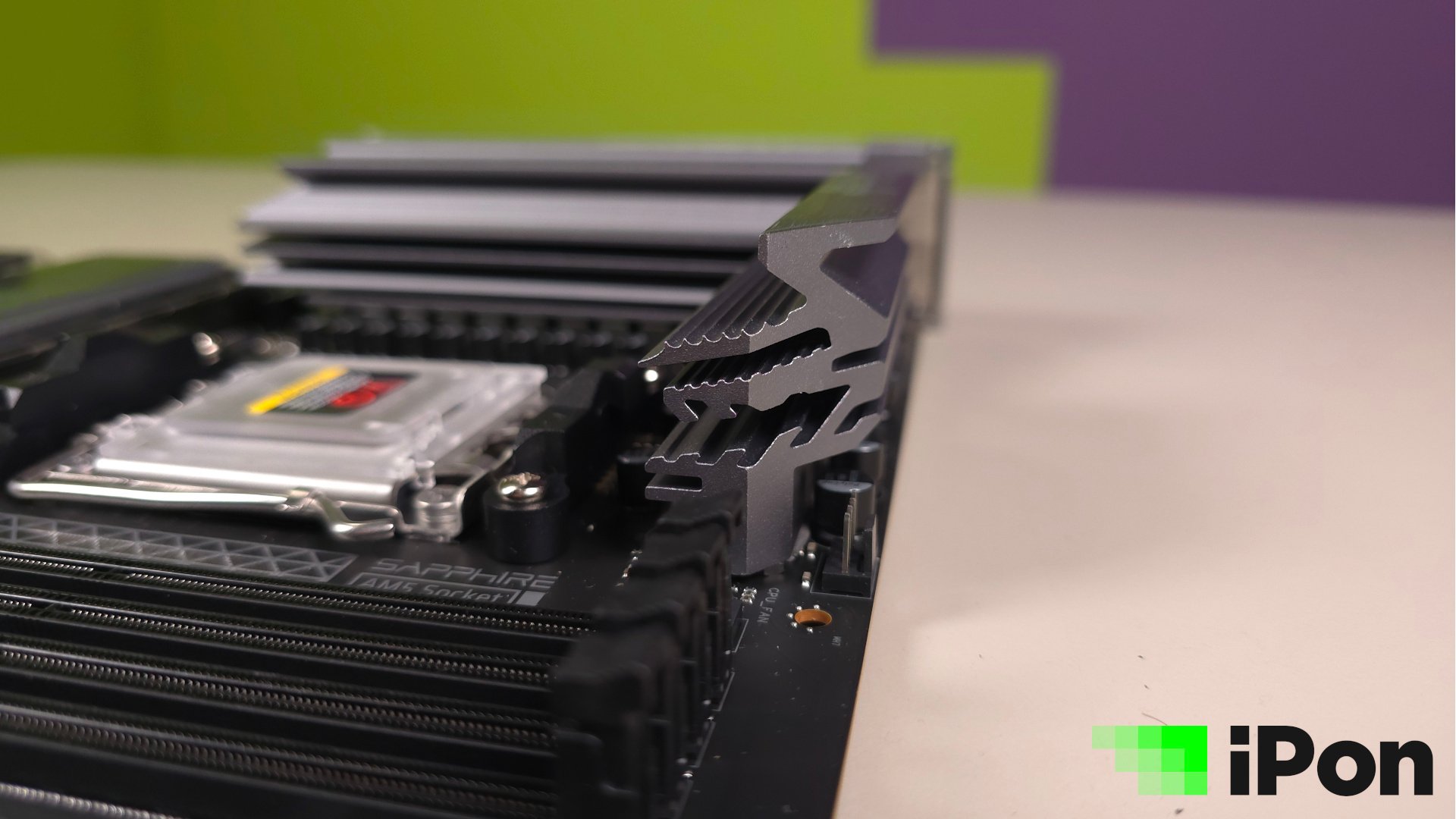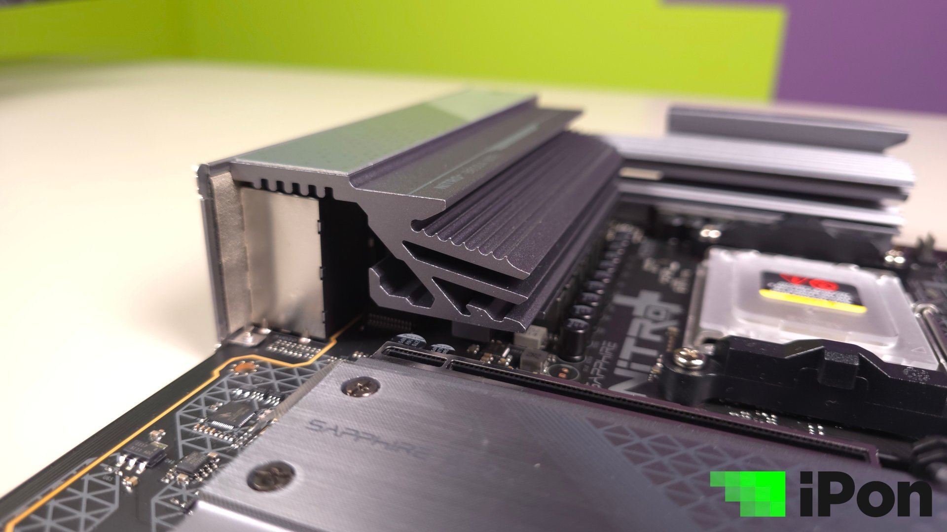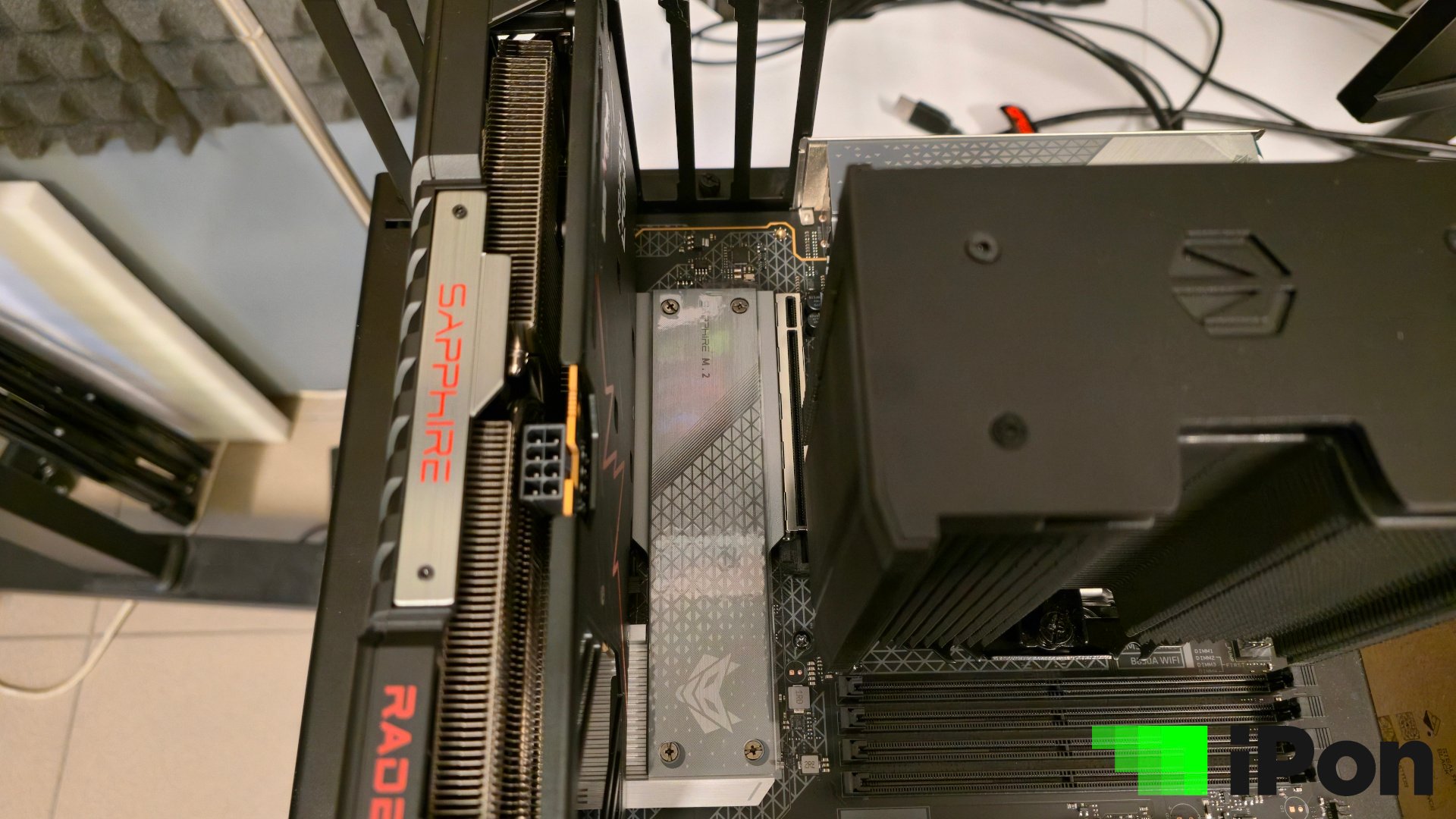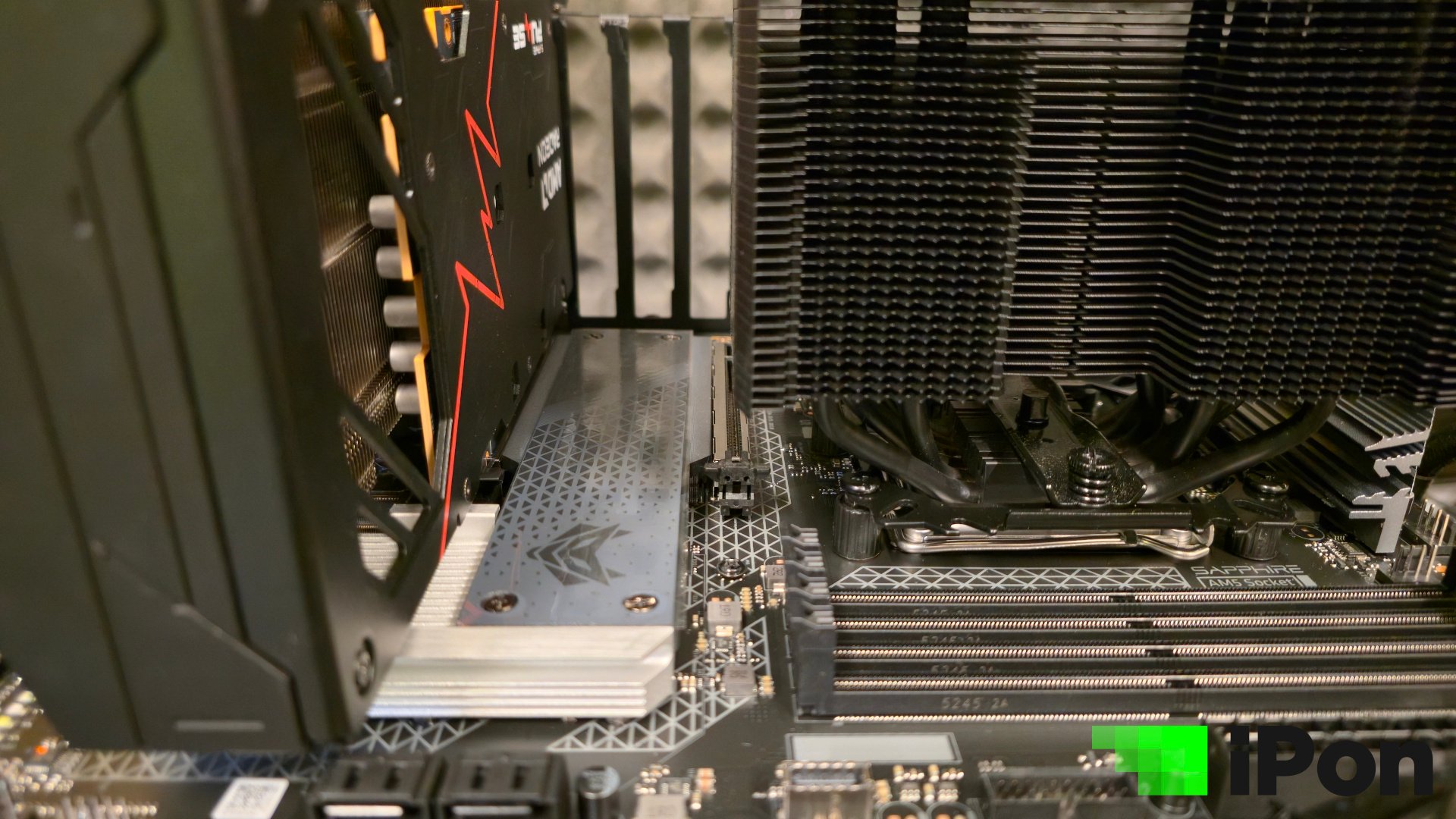 Mielőtt az M.2-es foglalatok és a hűtésük jönne, nem bírtam megállni, hogy ellőbb ne ejtsek szót egy olyan szarvashibáról, amit érthetetlen módon a Sapphire-nek nem sikerült elkerülnie. Középkategóriás lap lévén jó esély van rá, hogy a vásárló a jó öreg toronyhűtőjét szeretné majd használni, a videokártyát pedig lehetőleg a felső PCIe foglalatba illesztené. Nos, itt több érdekességre is érdemes figyelni. Először is sajnos alaposan elmérték a centimétereket, ugyanis az Endorfy Fortis 5 hűtője pont annyira lógott rá a felső slotra, hogy a VGA csak a másodikban férjen el. Ez azt jelenti, hogy a Dark Rock vagy NH-D15 hűtők is teljesen esélytelenek és lényegében minden hasonló, amit nagyobb teljesítményre terveztek.