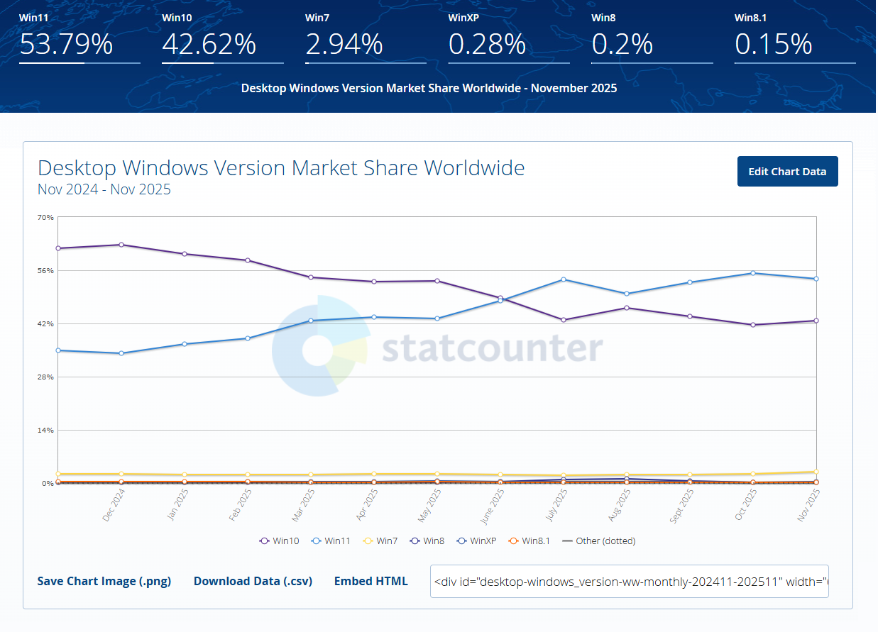 A StatCounter legfrissebb adatai szerint a Windows 10 jelenleg 42,62%-os piaci részesedéssel rendelkezik, míg a Windows 11 esetében immár 53,79%-os piaci részesedés mutatkozik. Közben a korábban nagy népszerűségnek örvendő Windows 7 is képviselteti magát a listán, de már csak 3% alatti piaci részesedést tudhat magáénak, ami azért elég sok.