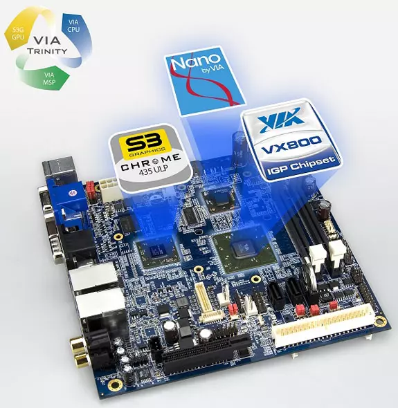 Az új alaplap a VIA Trinity platformjának részét képezi és egy 1,6 GHz-es Nano processzorral büszkélkedik. A lapkakészlet szerepét a már korábbról ismert VX800-as megoldás tölti be. Az alaplap két darab So-DIMM memóriafoglalattal bír, amelyekben maximum 4 GB-nyi DDR2-667 MHz-es modul helyezhető el. Az újdonság a felsoroltakon kívül egy IDE portot és két SATA 3 Gbps-os portot is tartalmaz.