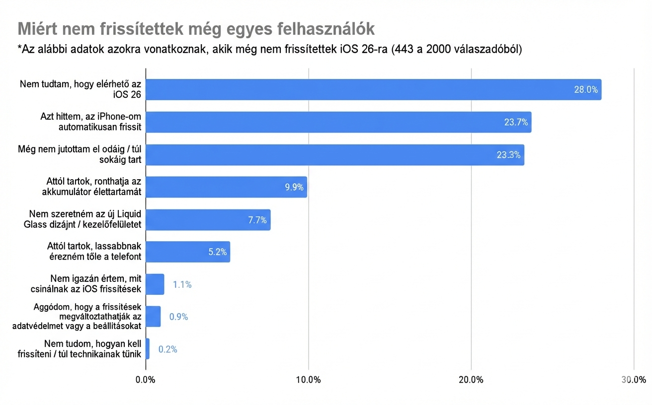 Az emberek 23,3 százaléka azért nem frissített, mert nem jutott még el addig, túl sok időt vesz igénybe a művelet. Az iOS 26-ról egyelőre lemondók között 9,9 százalék azért nem frissít, mert attól tart, hogy az új szoftveres környezet mellett gyorsabban merülne a mobiltelefonja.