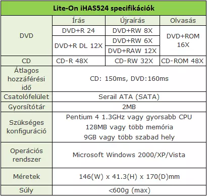 Az iHAS524-es Lite-On DVD-író 24x-es maximális sebességgel tudja pörkölni a DVD+R és DVD-R korongokat, a DVD-RAM és DVD+R DL/-RDL adathordozók esetében 12x-es, míg a DVD+RW lemezeknél 8x-os, a DVD-RW korongoknál pedig 6x-os írási sebesség áll rendelkezésre. A gyártó az új meghajtóhoz mellékeli a méltán népszerű Nero szoftver 8-as kiadását is, hogy azonnal megkezdhessük a munkát.