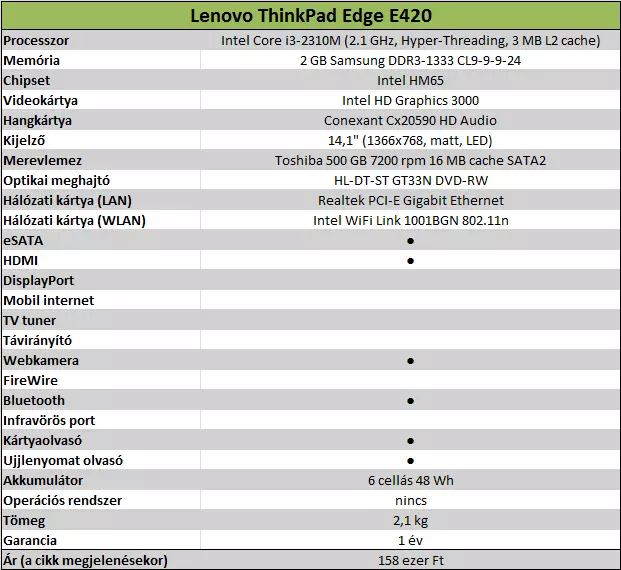 Első ránézésre az ár az, ami emelkedett, de ez csak azért tűnhet így, mert a kifutó darabokat már jelentős kedvezménnyel árulják ki a nagykereskedések is. Így fordulhat elő, hogy az előző generációs Arrandale magos Intel processzorral szerelt gép azonos ár mellett kétszer annyi memóriát és operációs rendszert is tartalmaz. Az újdonság viszont kárpótol az előd modellhez képest borsosabb árcéduláért, hiszen nagyobb kapacitású akkumulátort tartalmaz és a már említett külsőségeken felül másban is túlmutat bátyján. Sajnos alap kiépítés szerint továbbra is egy év garanciát kapunk, melyet ugyan meghosszabbíthatunk viszonylag jó áron, de érdemes lenne elgondolkodnia a Lenovo-nak azon, hogy ez az időtartamot legalább a duplájára növelje, ugyanis a Dell és a HP ilyen téren többet nyújtanak. A korábbiakhoz hasonlóan az E420 sem kérhető dedikált grafikus kártyával, így be kell érnünk az Intel leggyorsabb integráltjával.