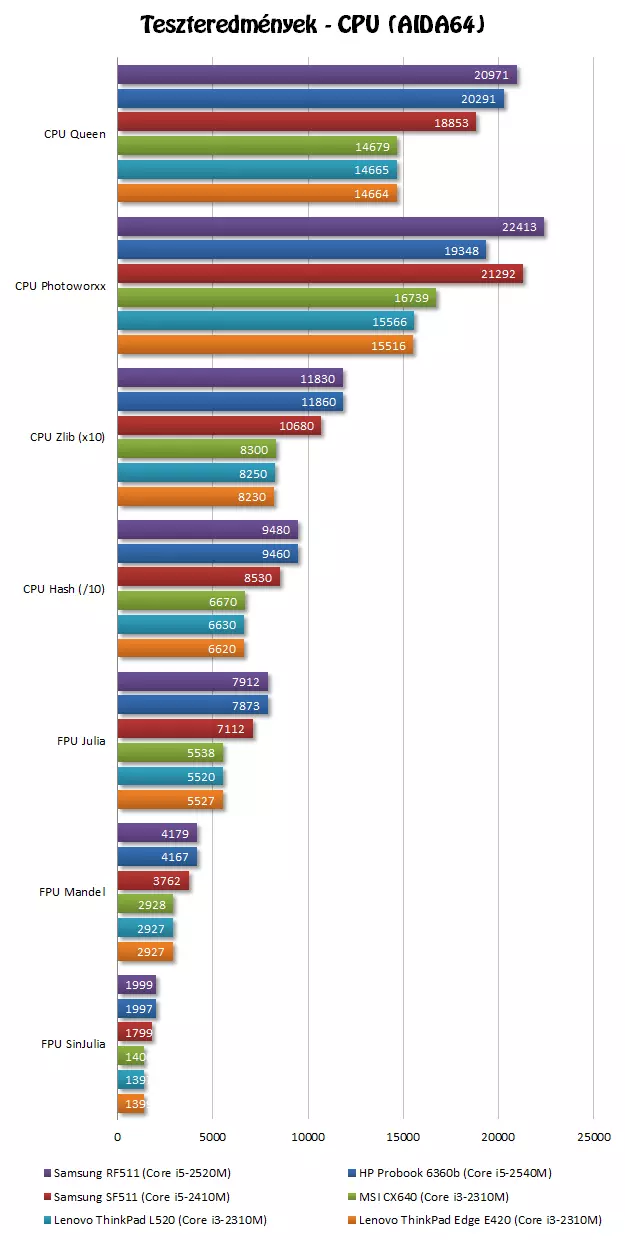 A szokásos teszteket elvégezve látható, hogy az E420-ban szolgálatot teljesítő Core i3-2310M processzor hozza a tőle elvárható szintet. A PCMark 7 úgy néz ki, hogy magára talált, ugyanis a Core i5-2410M-hez viszonyítva reális eredményeket kaptunk – ellentétben a korábbi i3-2310M-nél.