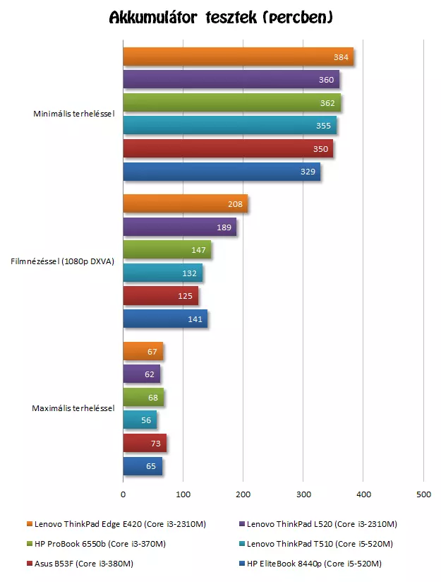 Ahol egyértelműen sokat fejlődött a korábbi generációhoz képest a 14”-os Edge, az az akkumulátoros üzemidő. Az előd modellt még négycellás teleppel kaptuk meg tesztre, amellyel alig két és fél óráig volt működőképes a gép. A vele együtt érkezett 15”-os verzió már hatcellás akksit tartalmazott, azzal kereken négy órát értünk el legjobb esetben, ehhez képest az E420 ugyanezzel az akkumulátorral majdnem hat és fél óráig bírta szuflával, amely ma már inkább átlagos eredménynek mondható, de mindenképpen figyelemreméltó különbség a korábbiakhoz képest.