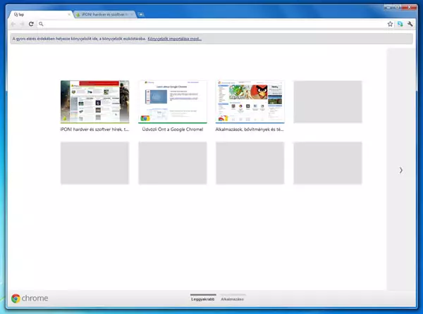 Az alkalmazások és a weboldalak listája között az alul található címkék, illetve a bal-, vagy jobboldalt található nyilak segítségével válthatunk. Az alkalmazásokat könnyedén felvehetjük és el is távolíthatjuk: új alkalmazás beszerzésére a Chrome Web Store-ban van lehetőség, míg a szükségtelennél vált alkalmazások eltávolításához ikonjukat a jobb alsó sarokba kell húzni. Ugyanez a módszer – a weboldal ikonjának lehúzása a jobb alsó sarokba – a kedvenc weboldalak eltávolításához is használható.