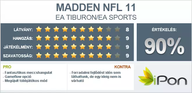 A Madden NFL 11 remek játék lett, a július végén megjelent demó messze nem tükrözi a végleges játék minőségét és lehetőségeit. Akkor úgy éreztük, hogy néhány apró módosításokkal ellőhetjük a tavalyi cikket a mostani a játékra is, azóta viszont beláttuk, hogy itt többről van szó a szokásos rókabőrnél. Az a lehetőség, hogy nem kell többet bénáznunk a stratégiákkal, sokkal közelebb hozza a futballt a szívünkhöz, máshogy tekintünk rá, mint eddig, a játék kedvesebb, szerethetőbb, könnyebb, emberközelibb lett, aki még nem merte kipróbálni a sorozatot, de a szíve mélyén mindig is szerette volna, az most tegye meg, nem fog csalódni!