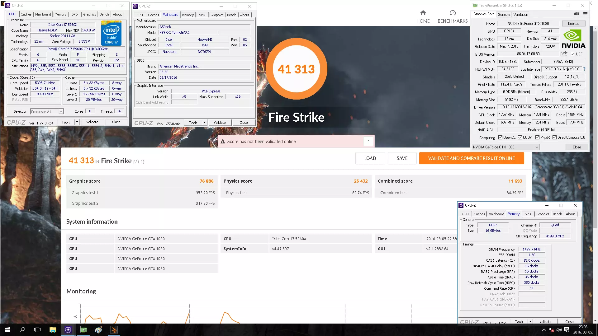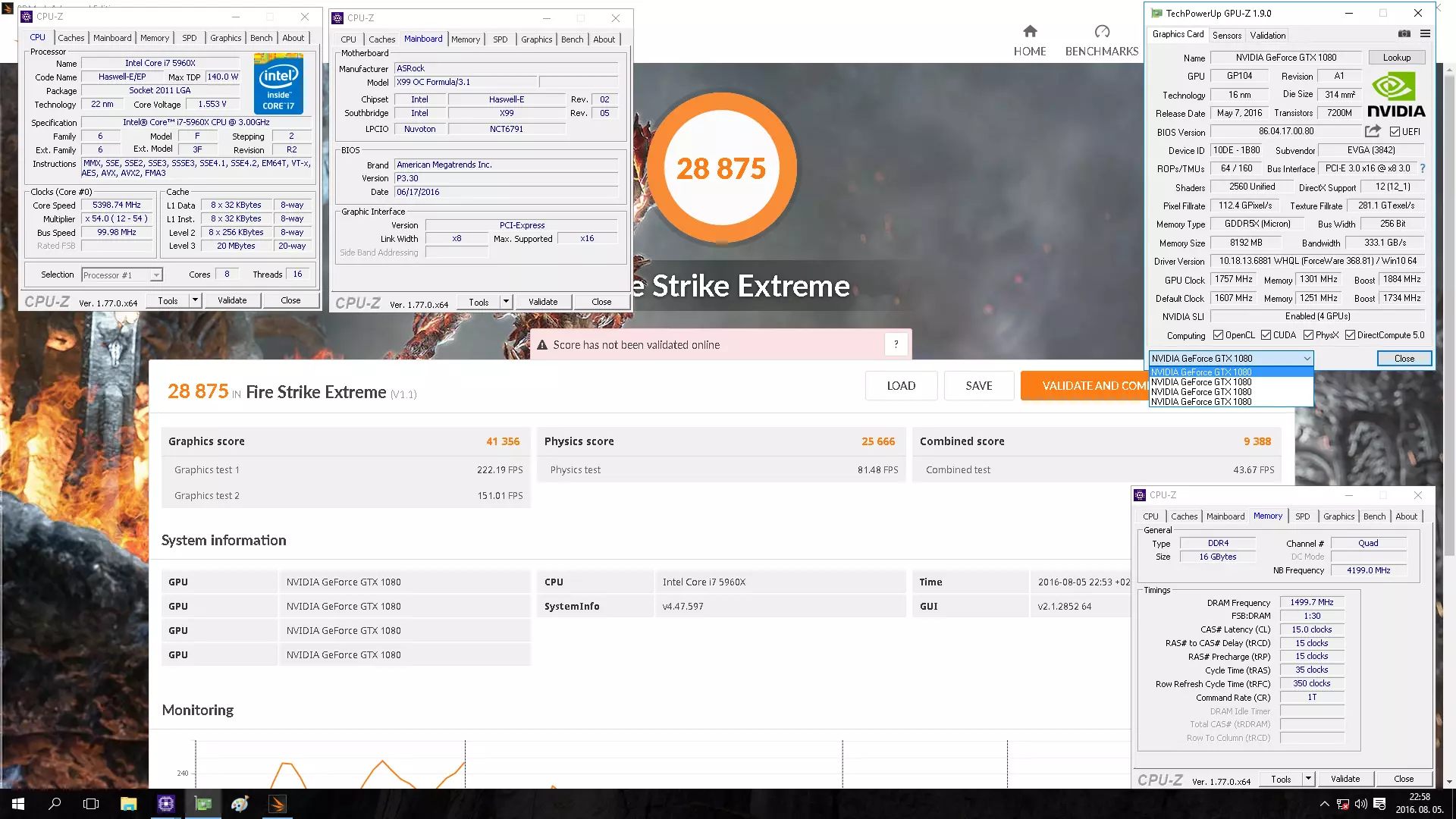 Persze kár lett volna itt megállni egy ilyen vassal, úgyhogy Fire Strike és Fire Strike Extreme alatt is készültek benchek. Előbbi 41313 pontos lett, ez világszinten 9. helyezést ér, itthon pedig elsőt, míg Extreme alatt sajnos nem sikerült bekerülni a top10-be, a 28875 pont 11. helyezést hozott (és elsőt itthon).
