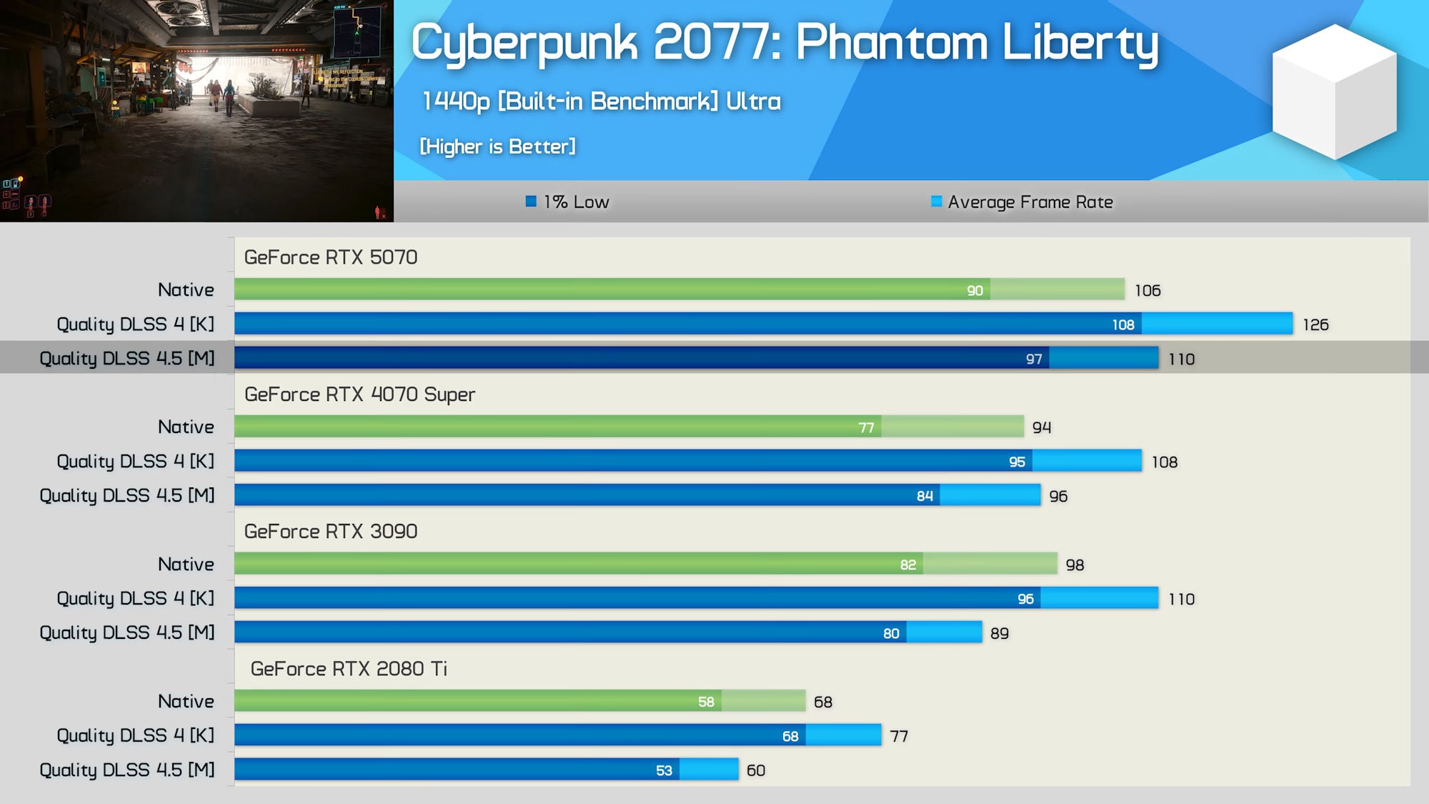 A Hardware Unboxed tesztjében a 4K-s helyett már 1440p-s felbontás volt érvényben a felskálázás pedig a „Quality” preset szerint működött. A mérések alapján a DLSS 4.5 a DLSS 4-hez képest nagyjából 9%-kal alacsonyabb FPS értékeket produkált a középkategóriás Blackwell videokártyák alatt, mint amilyen például a GeForce RTX 5070, míg az Ampere és a Turing alapú GeForce-oknál már akár 20-30%-os lassulás is bekövetkezhetett.