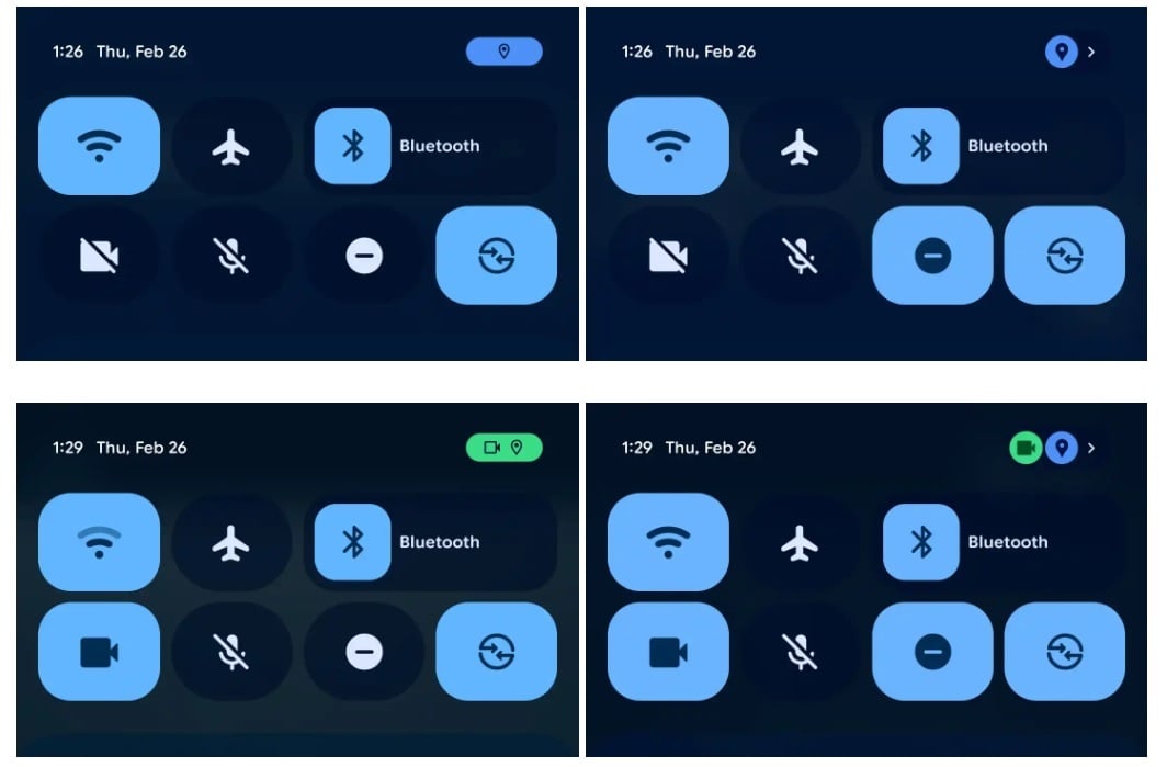 Az első beszámolók szerint a vállalat módosította a biztonsági indikátorokat, amik a kamera és a mikrofon működése esetén jelennek meg. Ezek kisebbek lettek, így kevesebb helyet foglalnak el, de a kamera és a mikrofon párhuzamos működése során már mindkét ikon külön jelenik meg, nem egy kapszulában. A gyorsbeállítások panelen újdonságot jelent majd, hogy a műholdas csatlakozási lehetőséggel kecsegtető eszközöknél ehhez is elérhető lesz egy kapcsolócsempe.