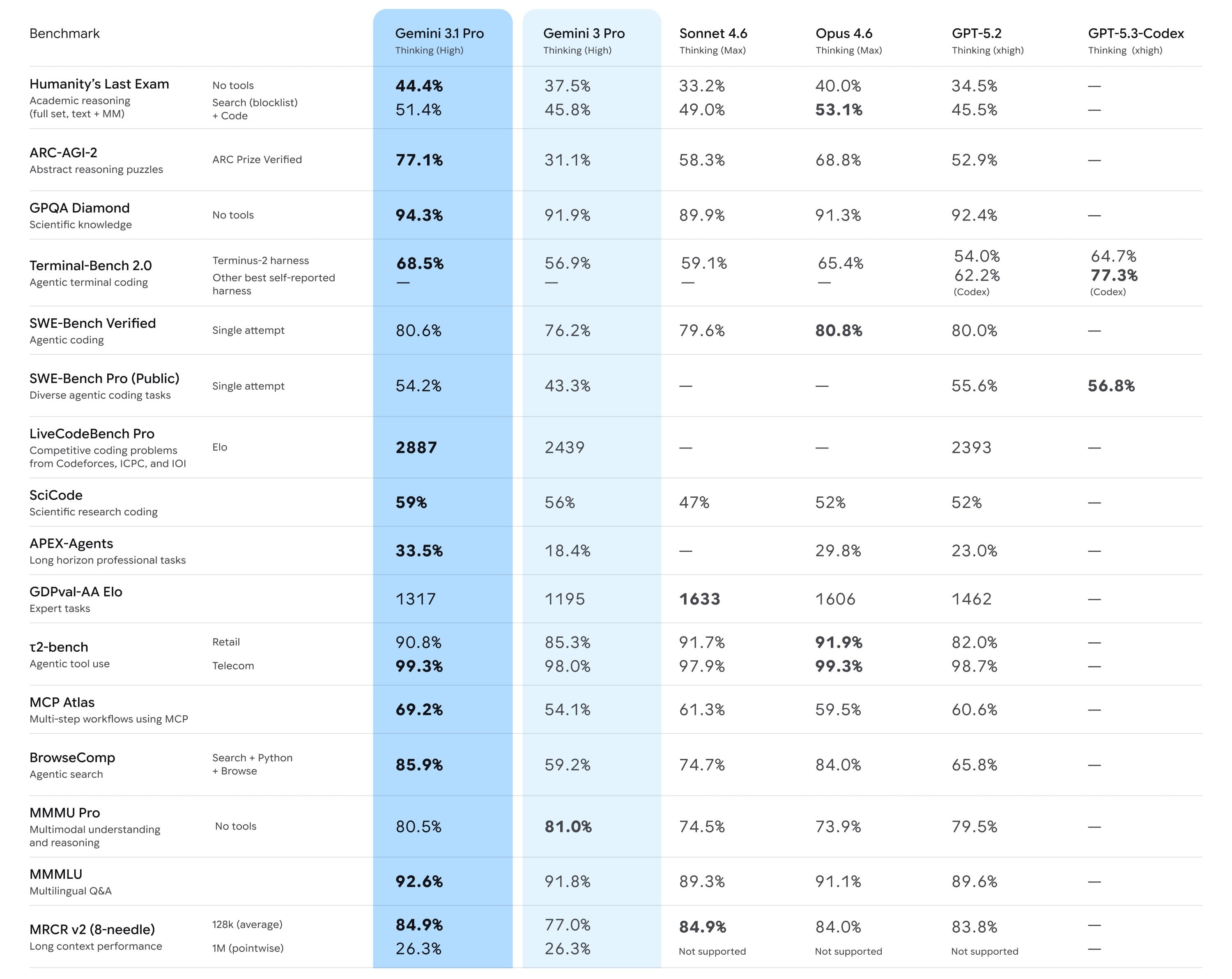 A legmodernebb mesterséges intelligencia alapú érvelési rendszerek hatékonyságának és képességeinek beható tesztelésére létrehozott ARC-AGI 2 megmérettetésben 77,1 százalékos eredményt ért el a Gemini 3.1 Pro, aminek csak az Opus 4.6 jár a közelében (68,8%), de a Gemini 3 Próhoz (31,1%) képest több mint kétszer jobban teljesít. Ennél csak a Gemini 3 Deep Think erősebb, de az már egy összetettebb mód. A Google sok tesztnek vetette alá az új modellt, és nemcsak azokat emelte, amikben a legjobbnak bizonyul, de a cég azon van, hogy minél több fronton lekörözze a versenytársait.