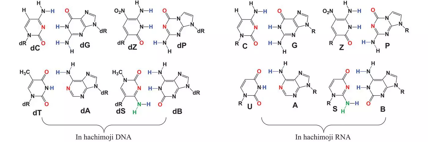 Ehhez a megfelelő pozícionáláshoz először is több új bázispárt is kialakítottak a szakértők, köztük az S és B nevű bázisokat, illetve a P és Z párost. A munka eredményeiről beszámoló legújabb tanulmányukban a szakértők arról számolnak be, hogyan kombinálták ezeket az új bázisokat természetes társaikkal. Az így létrehozott „nyolcbetűs” genetikai nyelvet hachimojinak nevezték el az alkotók, a japán ’nyolc’ és ’betű’ szavak alapján. Az új bázisok mindegyike szerkezetileg nagyon hasonlít a négy természetes bázis egyikére, de kötődési módjukban eltérnek ezektől.