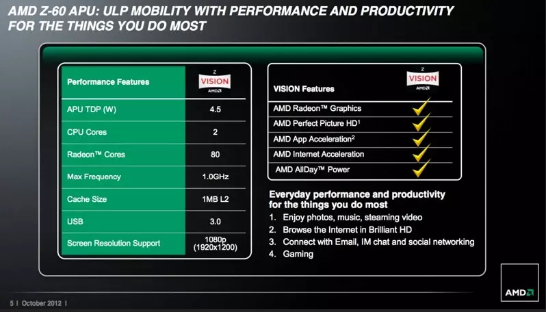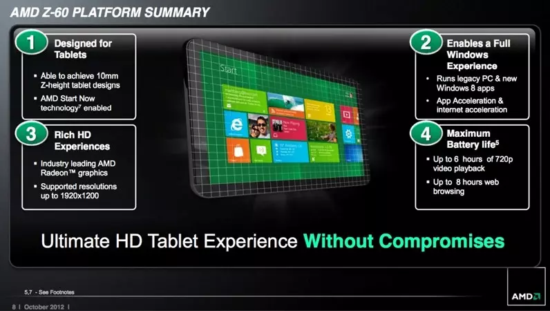 A Windows 8-as operációs rendszerrel felvértezett táblákat megcélzó újdonság elődje, a Z-01-es APU egység eddig nem volt valami népszerű a táblák körében: jelenleg csak egy olyan konfiguráció van forgalomban, amelyben az AMD alacsony fogyasztású APU egysége dolgozik. Remélhetőleg a Z-01 utódja, a Z-60 jóval sikeresebb lesz.